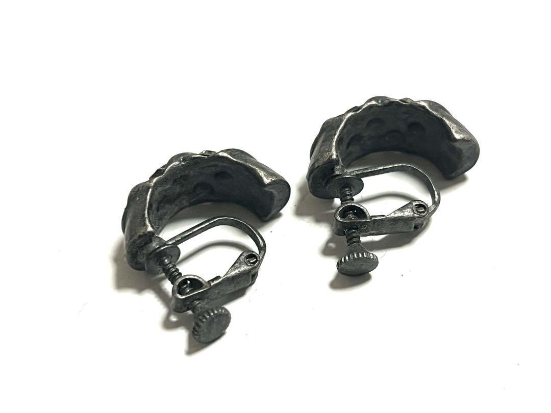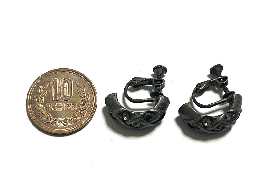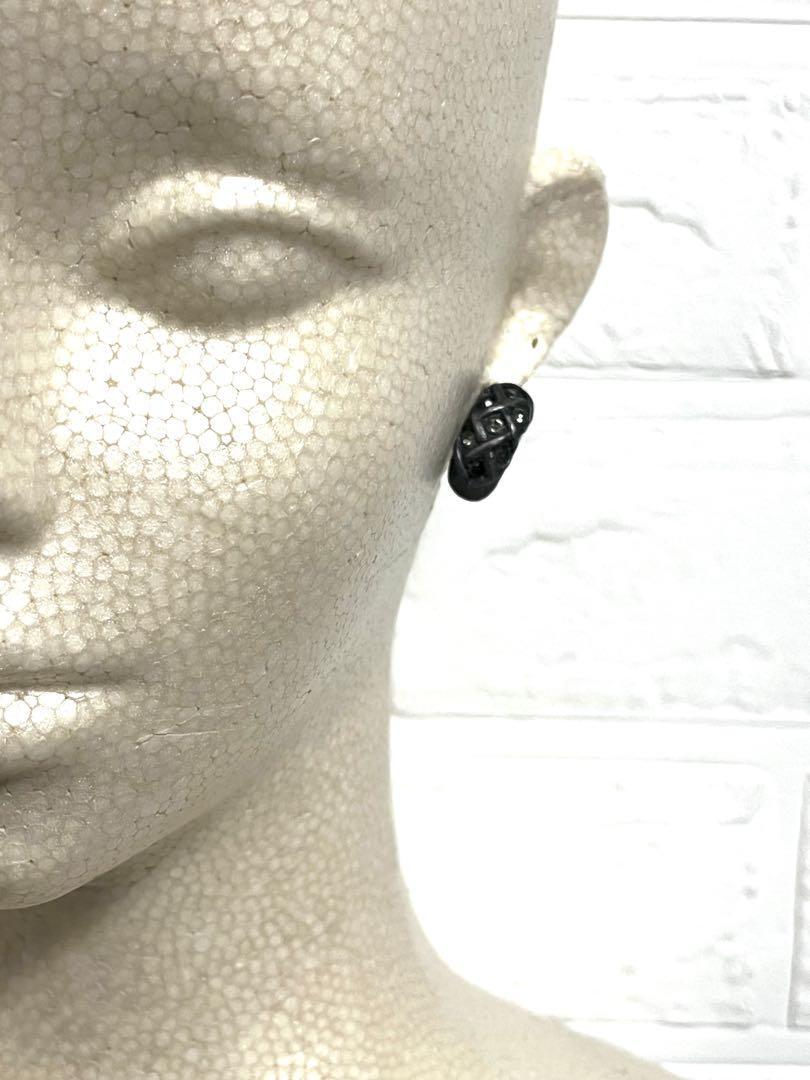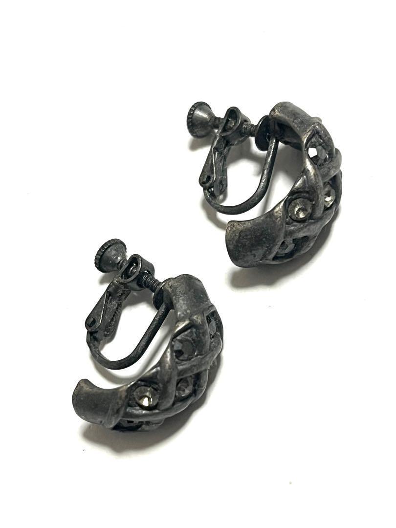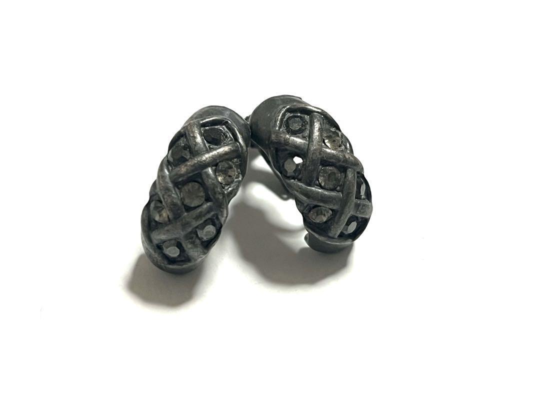 ダークシルバーの編み込みデザインにストーンがあしらわれたメタル製イヤリング