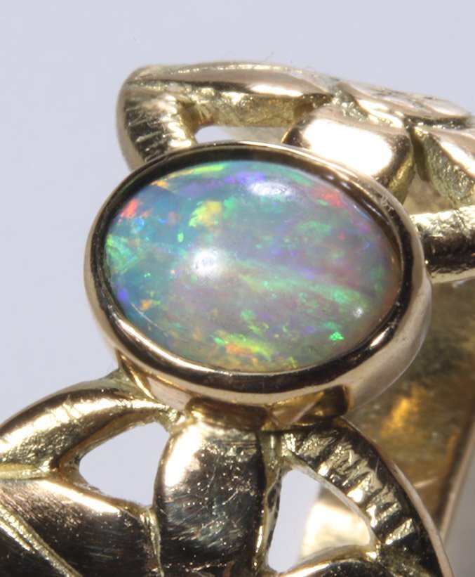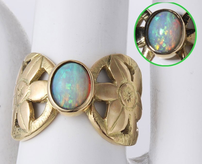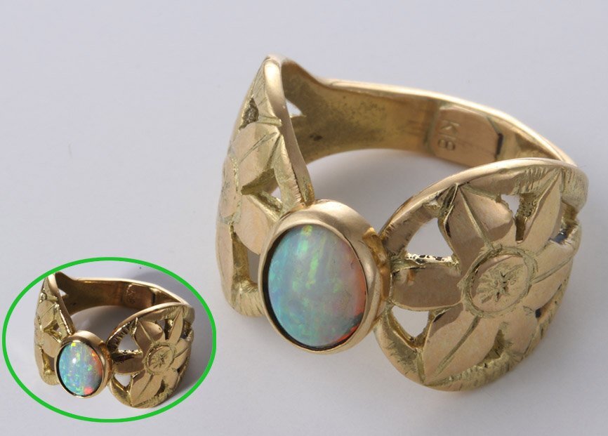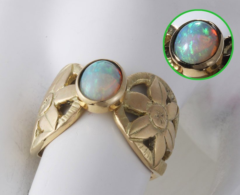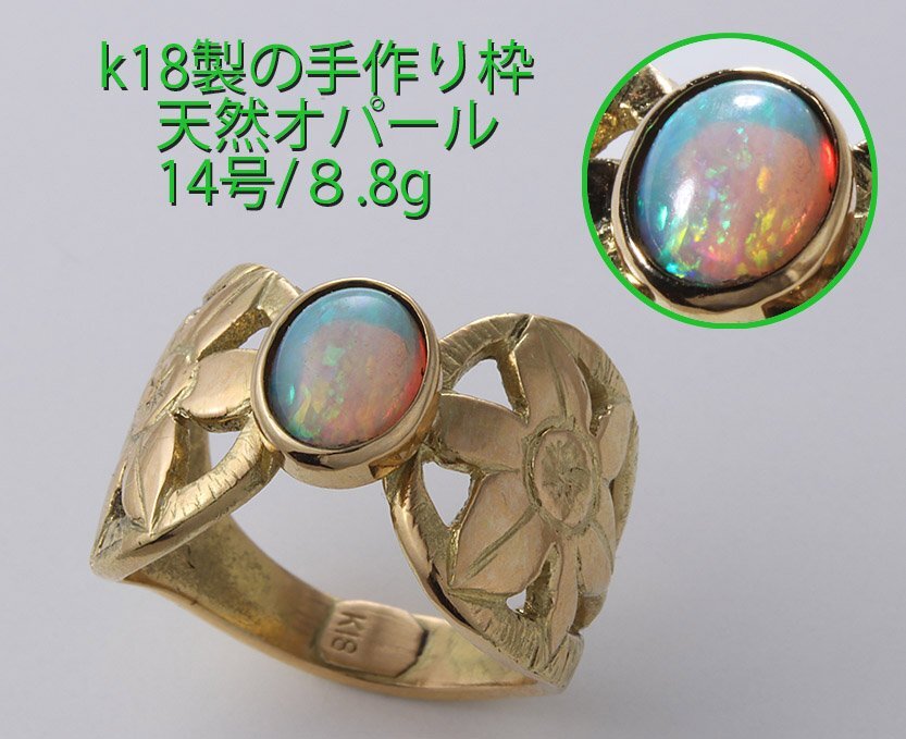 コメント | [[全ての商品に品質保証カードが付きますのでご安心ください]] 手造りのオパールリングです。ゴールドの細部を見ると手造りが感じられます。柔らかな光線下では大人しい遊色に見えますが、強い光線下では豊かな遊色が見られます。 |