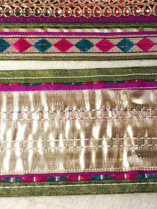 赤紫やカーキ、金色の組み合わせの幅広のテープです。
