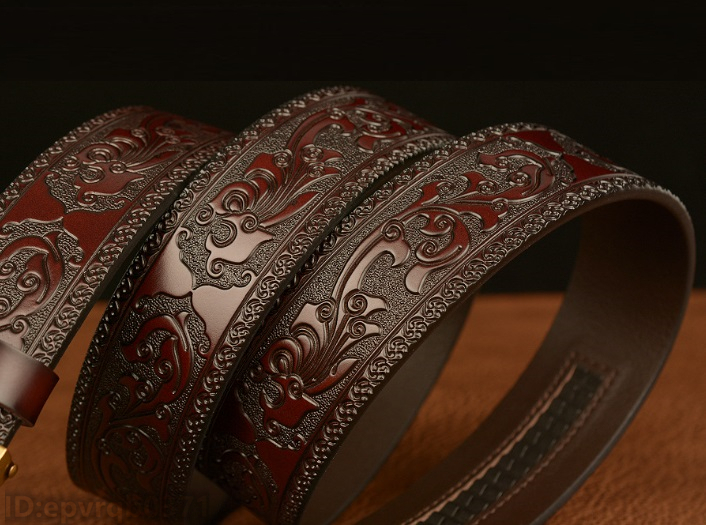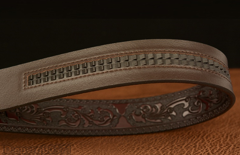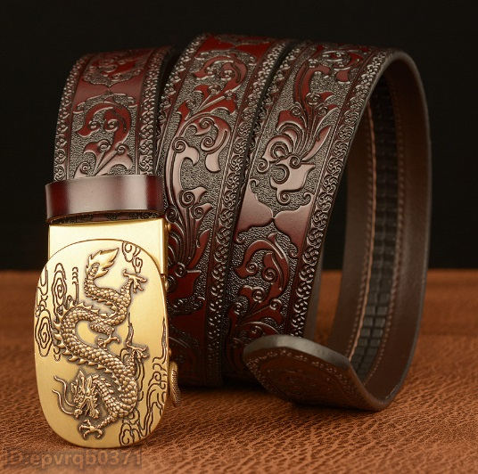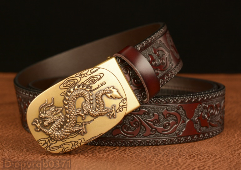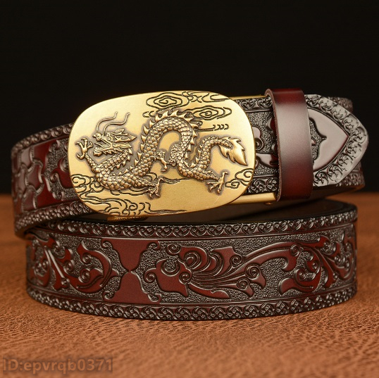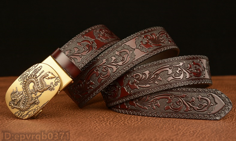 レザーベルト 新品 メンズベルト 本革 オートロック式 ドラゴン 金属バックル 柄物 幅3.5センチ 紳士用 長さ調整可能 /茶色