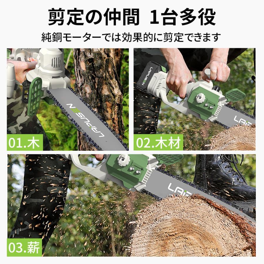 充電式チェーンソーは普通のこぎりよりも切断が速く、耐磨耗性に優れた高硬度の素材を使用しています。内蔵モーターには過電流保護、過熱保護、充電保護などの機能があり、作業中の安全性が確保されます。