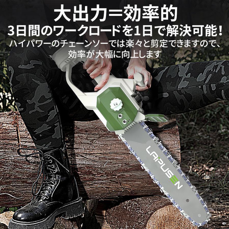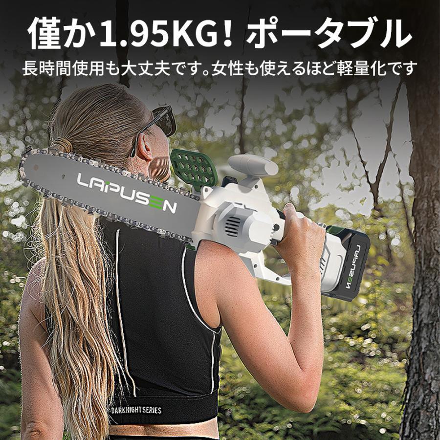 軽量でコンパクトなチェーンソーは、わずか1.95kgで片手でも操作が容易です。大容量バッテリーを搭載し、30分以上の長時間作業が可能で、予備のバッテリーも付属しています。