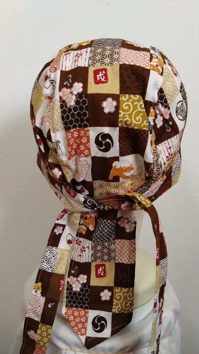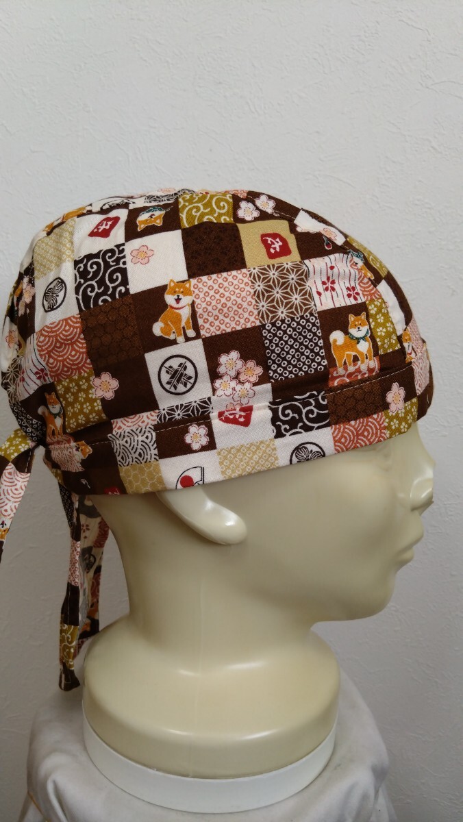 ★バンダナキャップ★ハンドメイド 和柄 柴犬 唐草 麻の葉 パッチ 茶