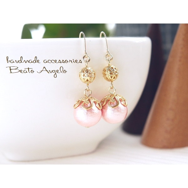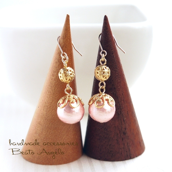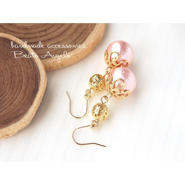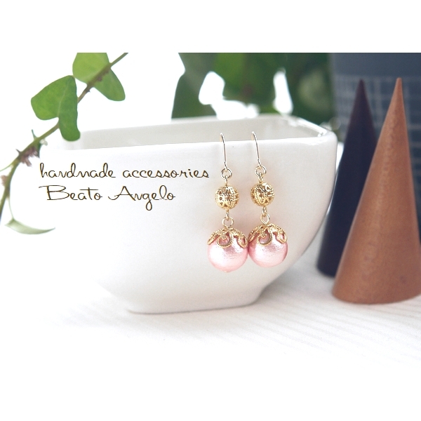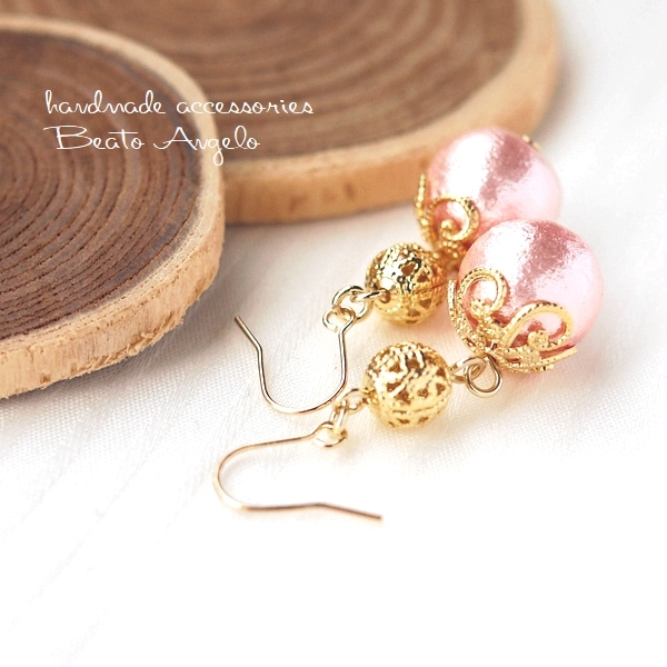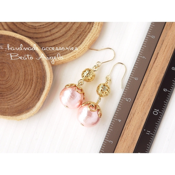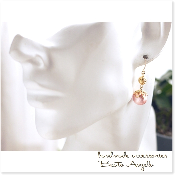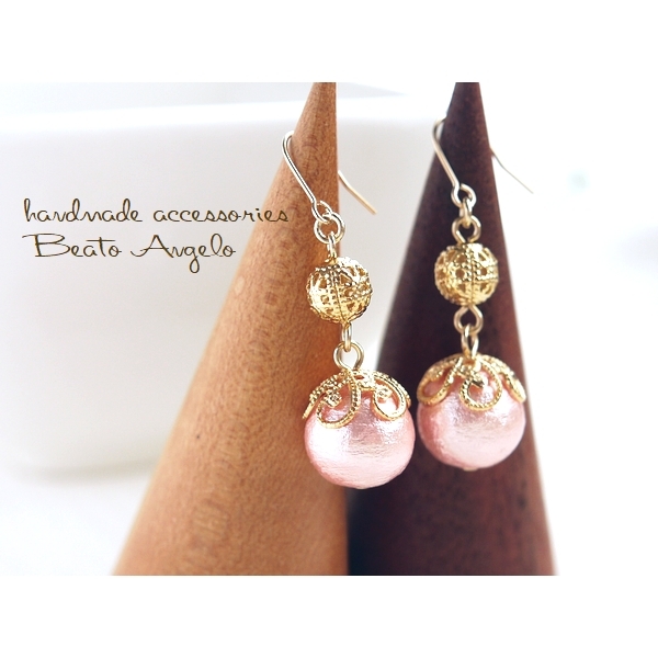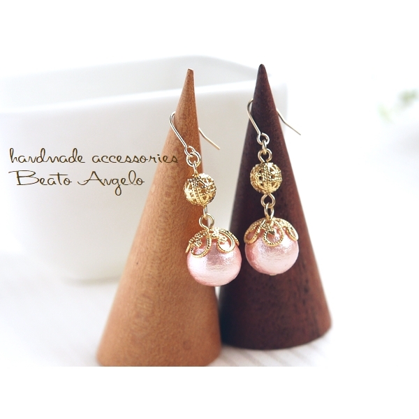 ■+angelo+コットンパールと透かし玉のピアス(p-449)ダークピンク G 10mm 花座