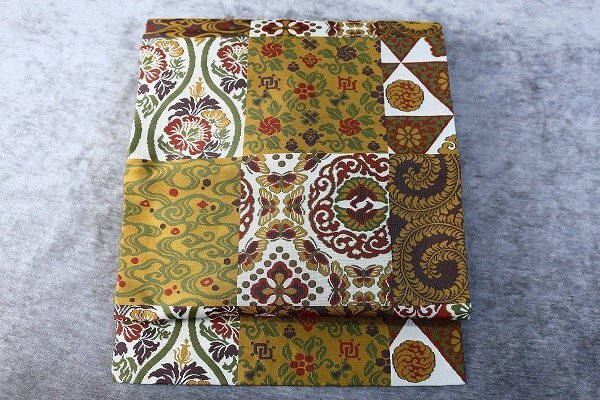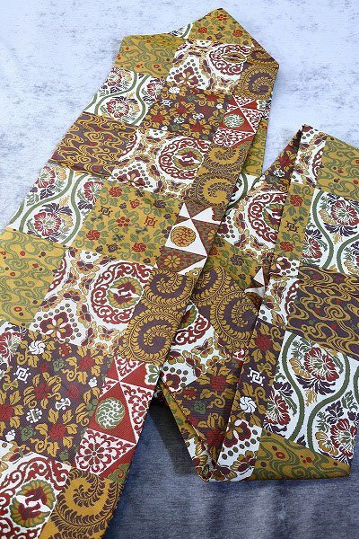 | 【送料無料】未使用品 名古屋帯 有職文様 吉祥文様 芥子色 オリエンタル 長さ3m74cm カジュアル 正絹 仕立て上がり m-3918 |