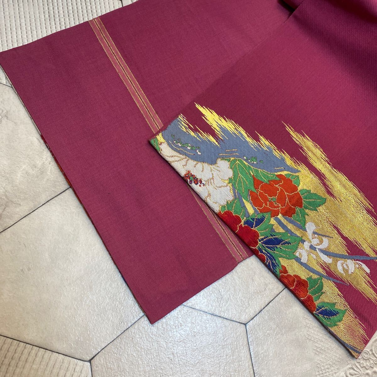 アンティーク 袋帯 着物 椿 梅 菊 金糸 唐織 紅色 昭和レトロ 大正ロマン モダン 和洋折衷コーデ リメイク う10-08y