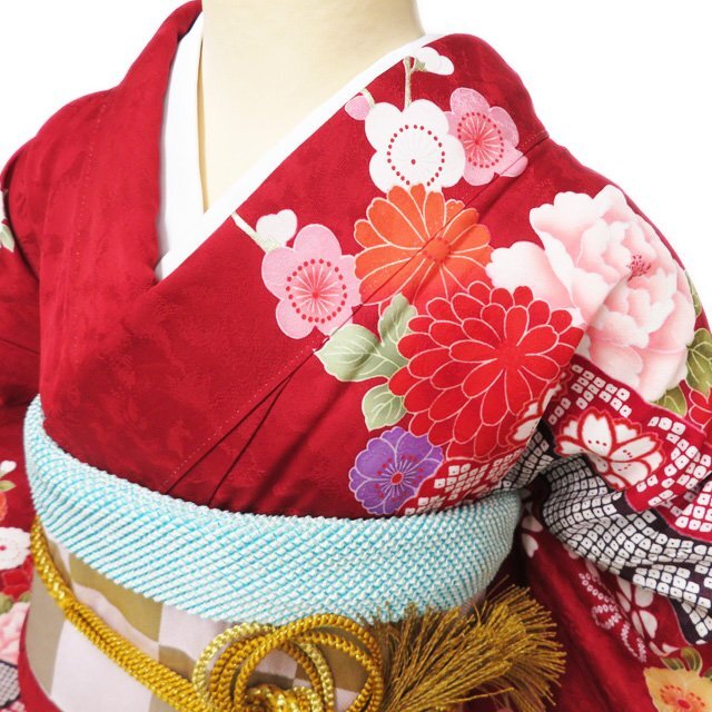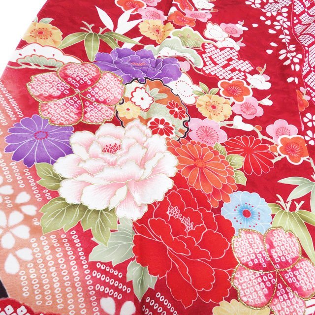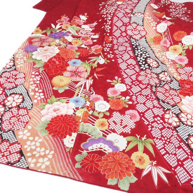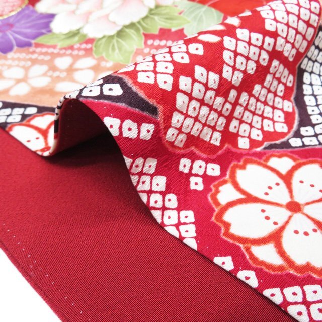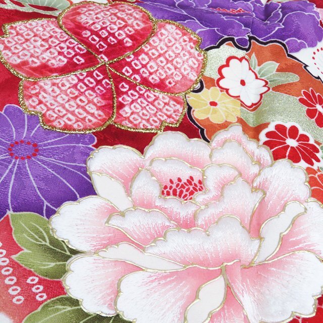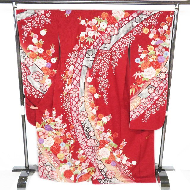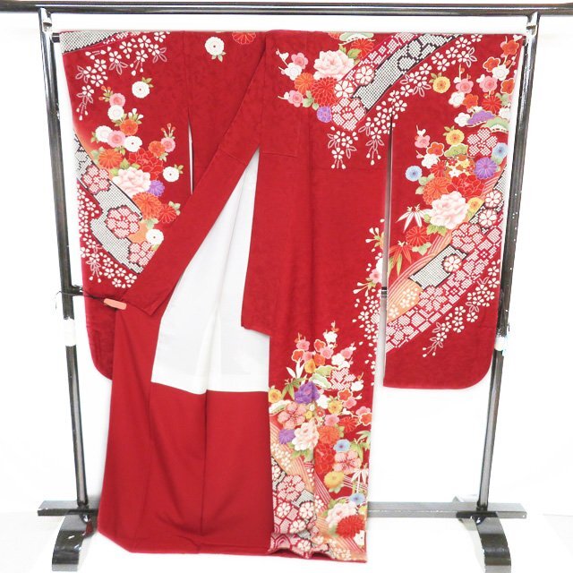 丈174cm(+12) 裄70cm(+3) 袖丈108cm(+10) 前幅22.5cm 後幅29.5cm ※サイズのお直し、承ります。 (身丈のみ、身幅のみのお直しは承っておりません) ※身丈は肩から測っております。 ※()内の数字はお直しで直せる長さを示しています。お仕立て直しの場合は胴裏を付け替えるため、さらに長く直せる場合があります。詳しくはお問い合わせください。 単位:cm 素材 正絹 商品ランク B ●お色 赤色 多色 金 使用感の少ない、美しいお品物です。 華やかな装いをお楽しみください。 写真に写っている着物のみの販売で帯等の付属品はついておりません。 一部商品は実店舗・他サイトでも並行して販売しておりますので売り切れの際はご了承ください。 その他多数販売中 gu- | ||||||