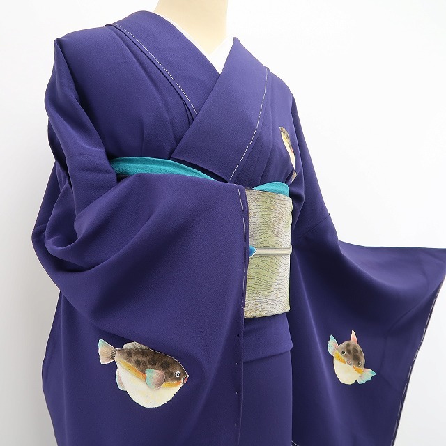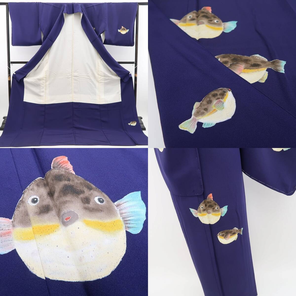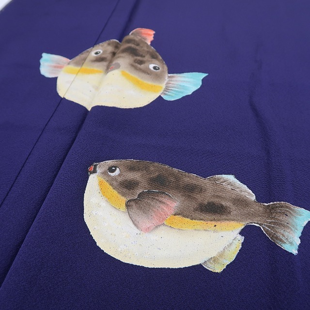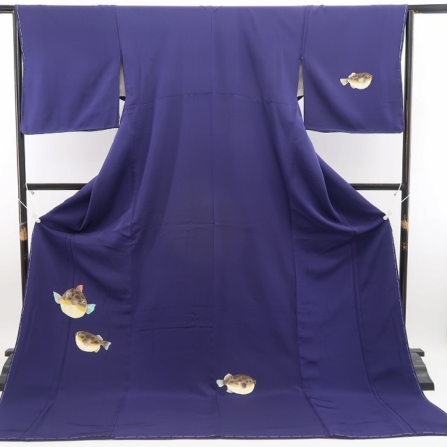 深みある鉄紺色の彩色が誘うどこか大人びた艶、付下げの構図にお道化た表情を魅せる愛嬌フグのデザインモチーフ、それは“おとな色に和を奏でるモダンな感性”、丁寧な柄付けと創作物ならではの独創性が魅力、ダイレクトに和装の醍醐味を味わえるひと品です。