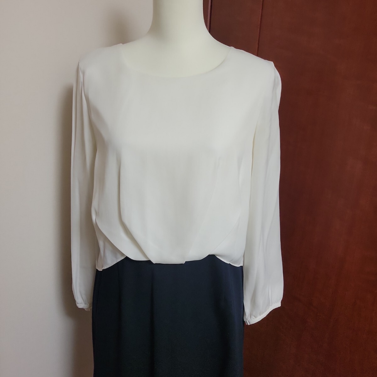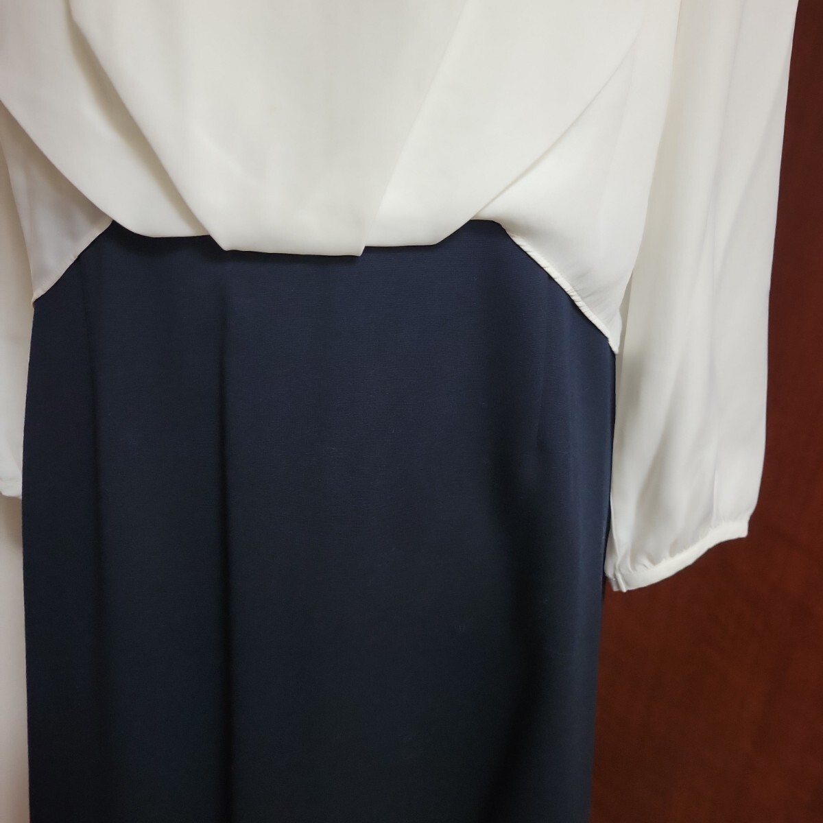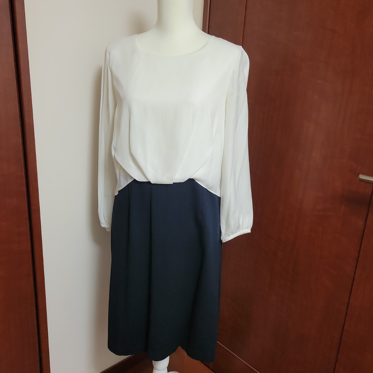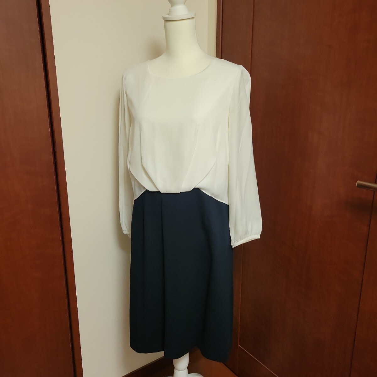 シンプルでエレガントなホワイト・ネイビーのひざ丈ワンピース、柔らかい生地で快適な着心地。