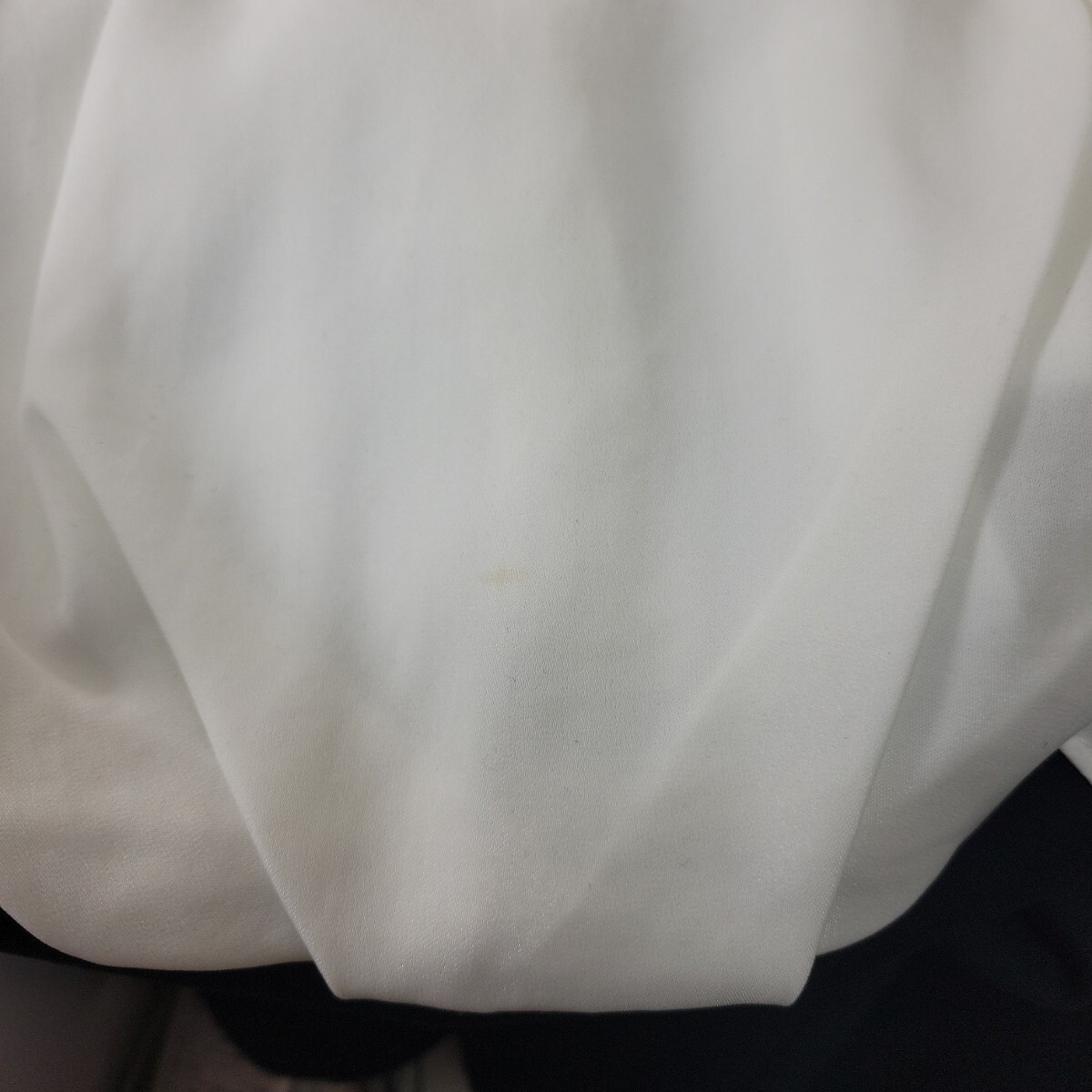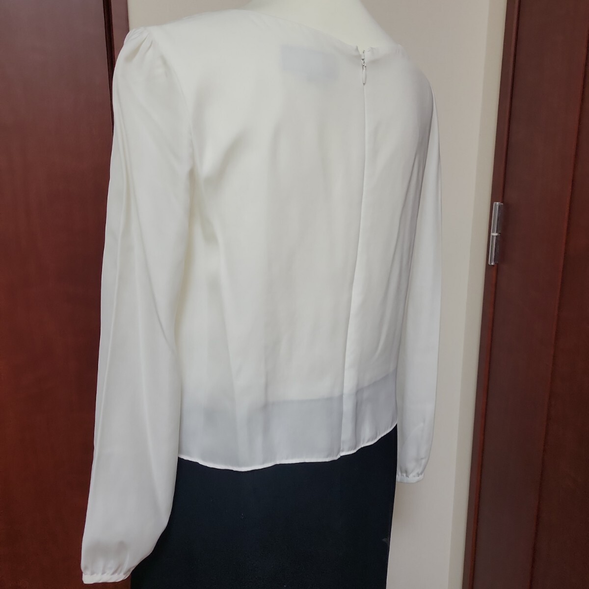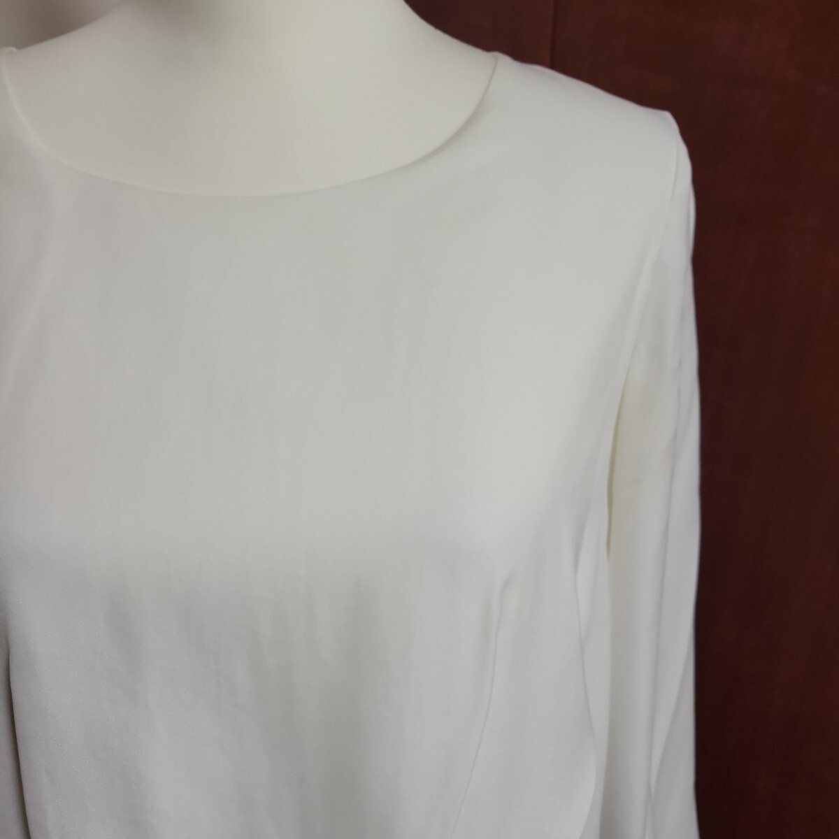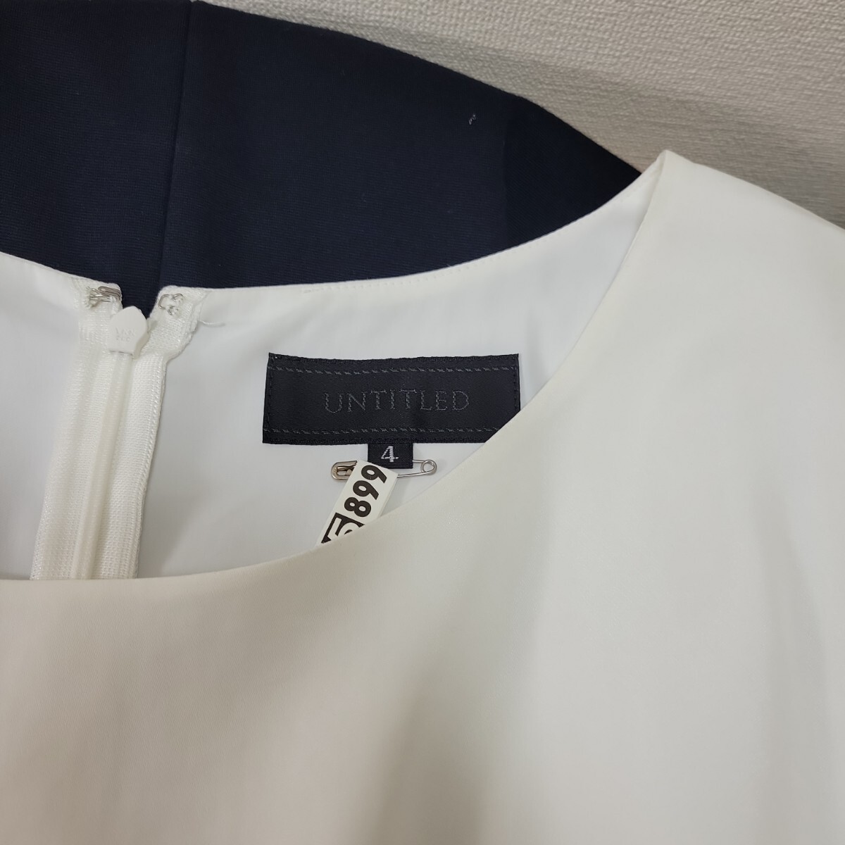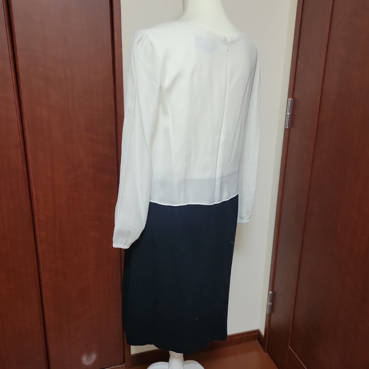 シンプルでエレガントなホワイト・ネイビーのひざ丈ワンピース、柔らかい生地で快適な着心地。