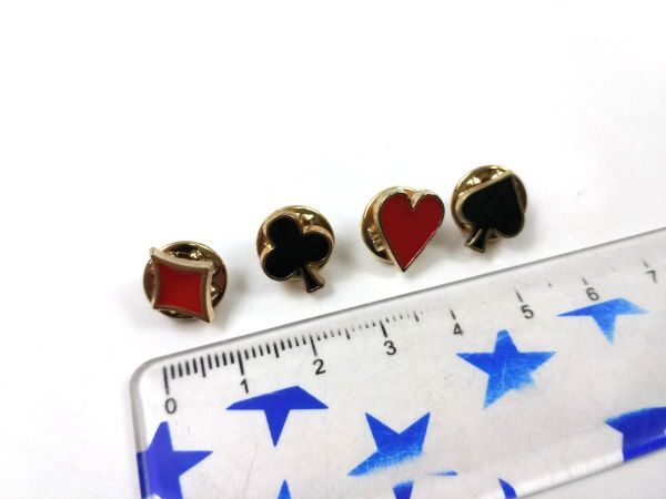 トランプ エース ピンバッジ 4個セット カラーは写真の通り。 サイズ:約1cm X 1cm 素材:おそらく合金製 自宅保管の未使用品です。 パッケージはありません。 |