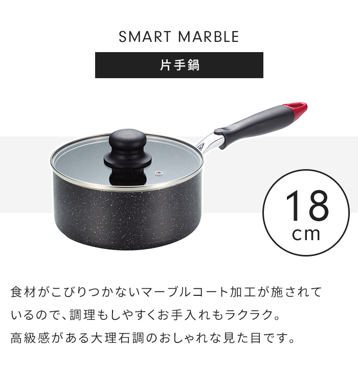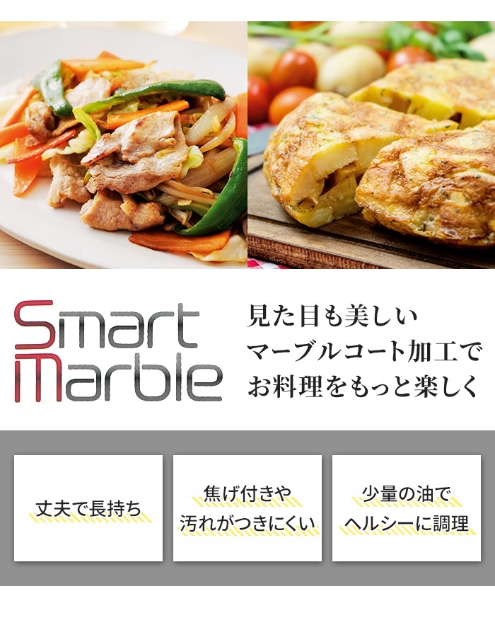 | 【Smart Marble】 見た目も美しいマーブルコートシリーズ。 全ての熱源に対応しています。(※電子レンジ・オーブンレンジには使用できません) |