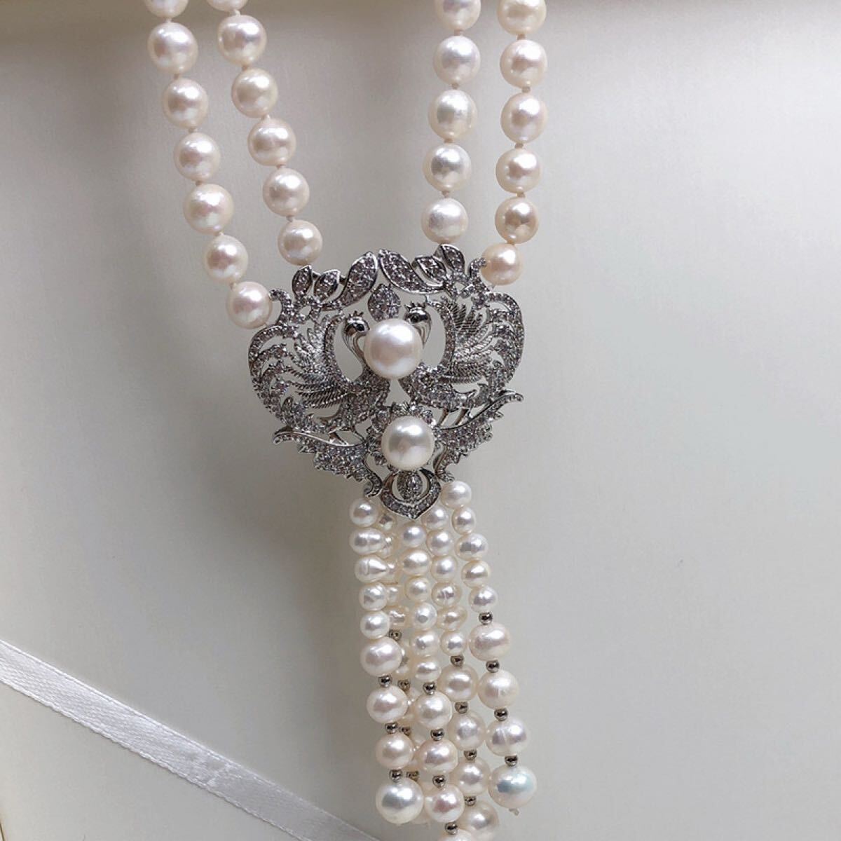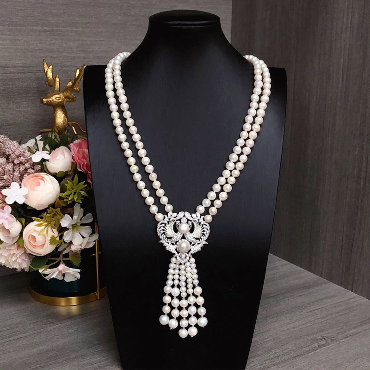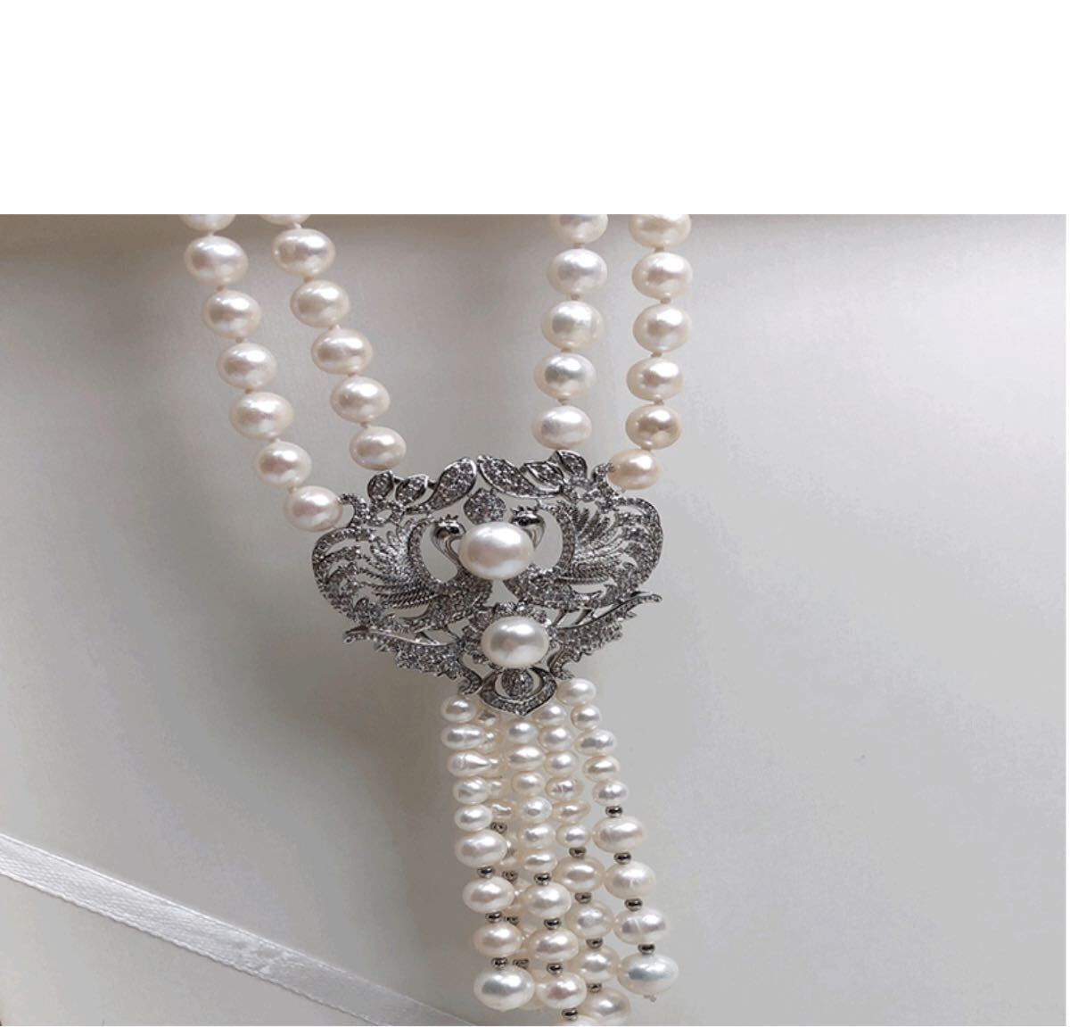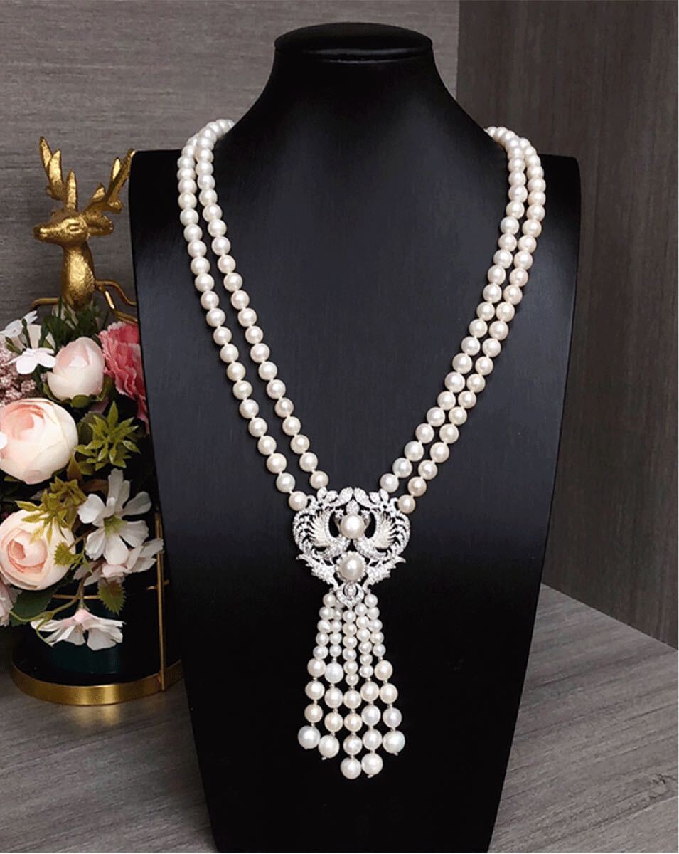 本真珠ネックレス 2連大玉淡水パールペンダント付き