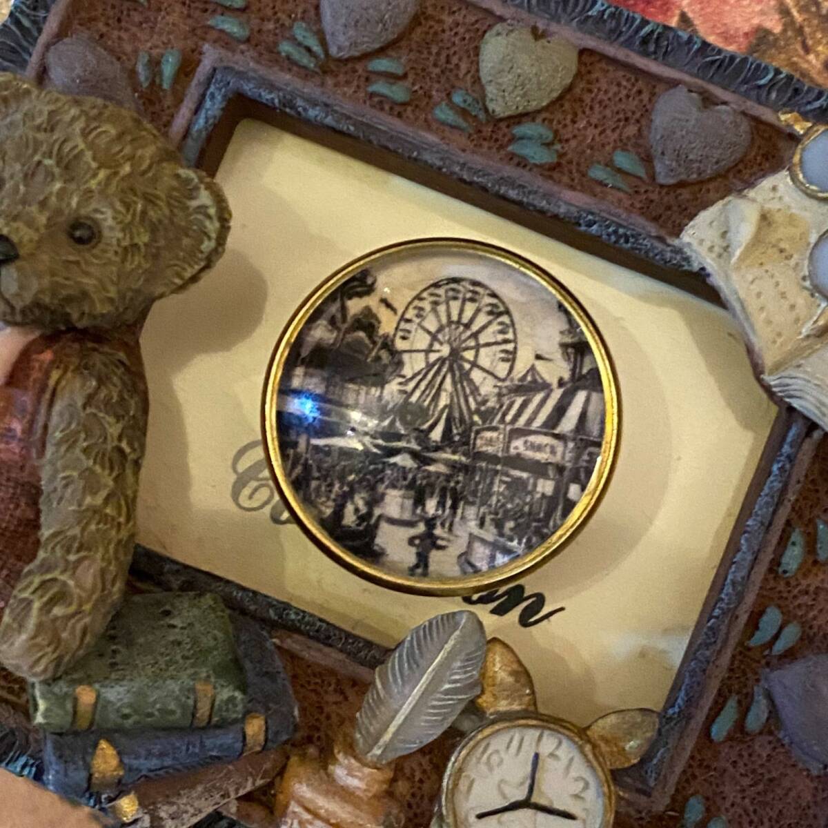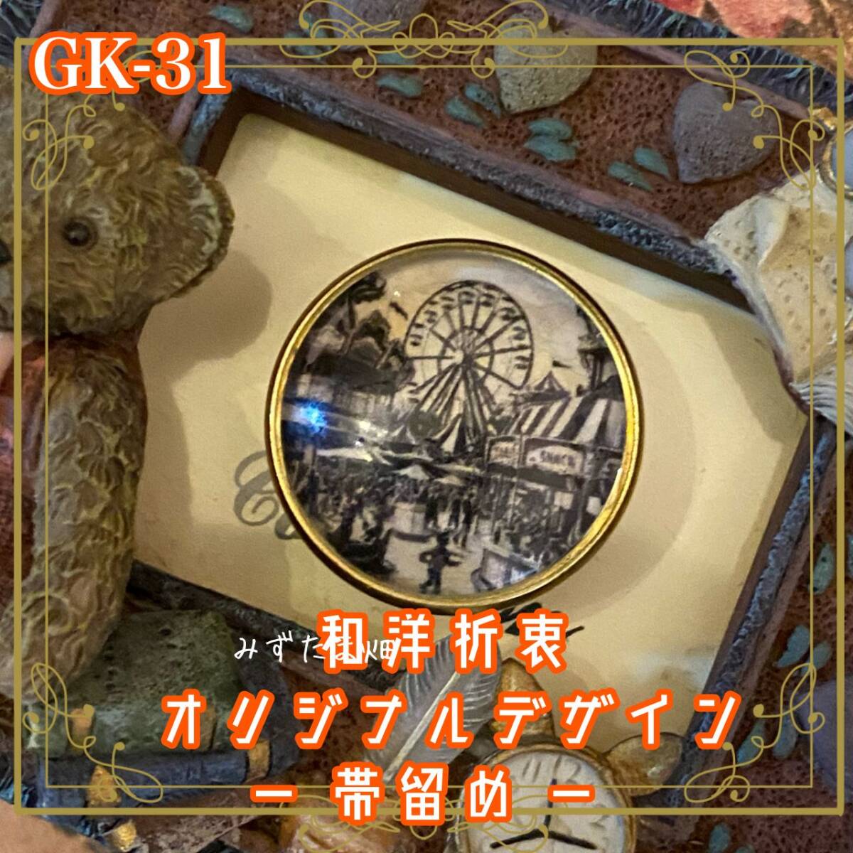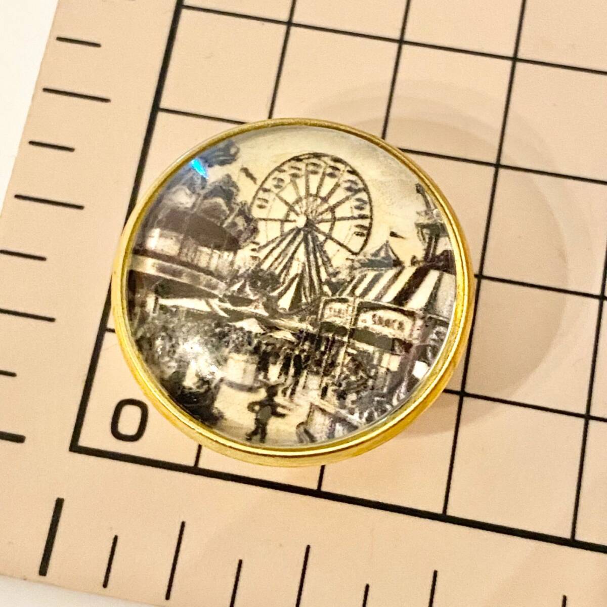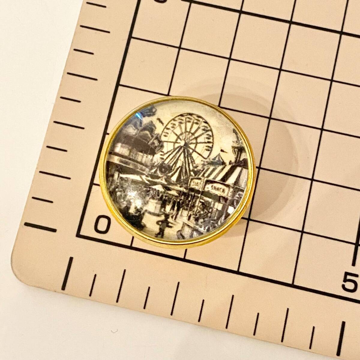 【着物 ハンドメイド ガラス 帯留め|和洋折衷のアクセントに オリジナルデザイン 白黒のセピア調で描かれた、美しい遊園地の風景。 GK-31】