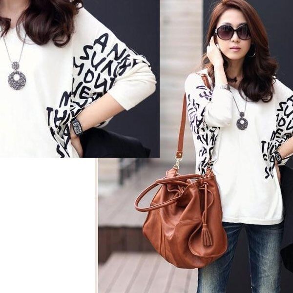 トップス、Tシャツ、長袖、白色、ドルマン袖、ゆるカットソー、英字プリント