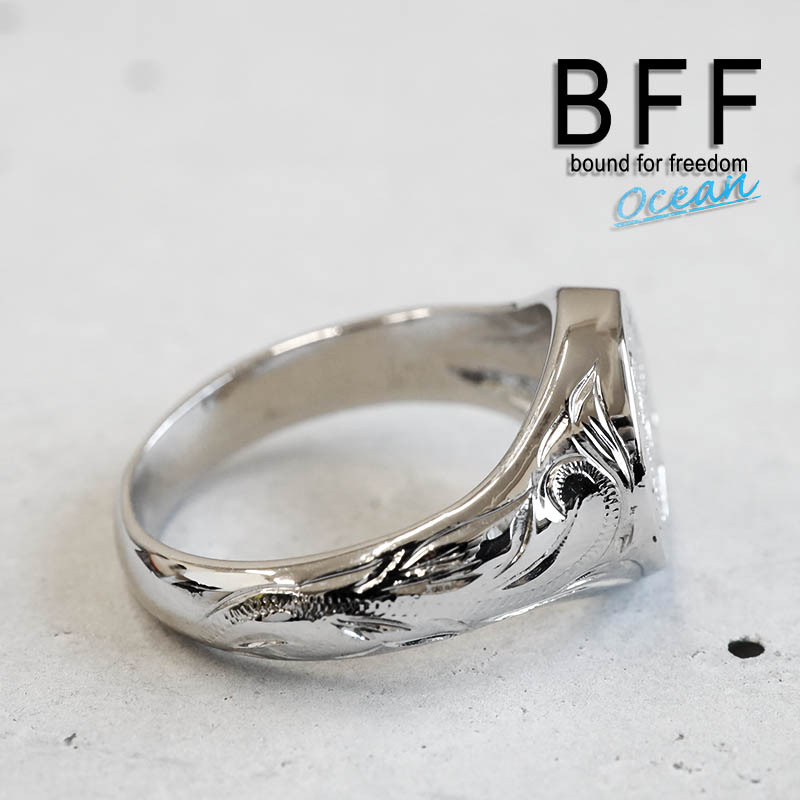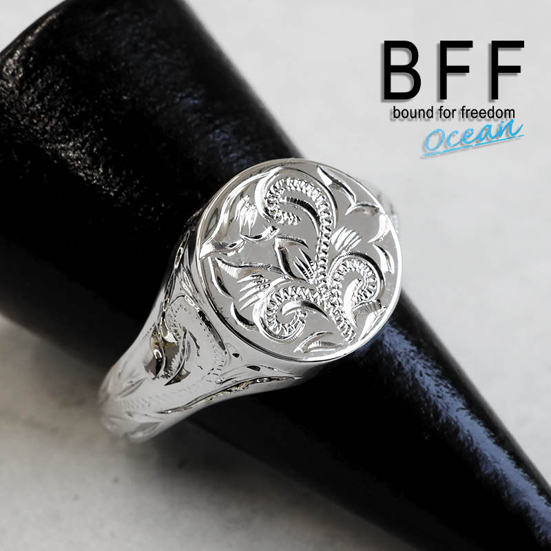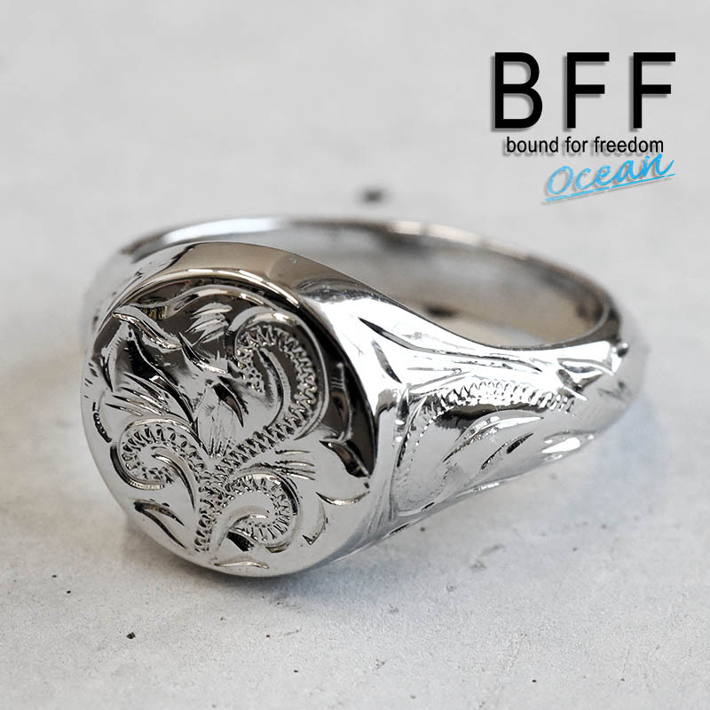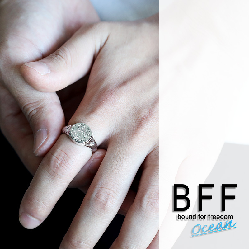 印台にハワイアンのデザインを取り入れた珍しいリング。シンプルで存在感のある丸型の印台に流れるようなスクロールとハワイでは神聖な葉として知られるマイレをレリーフ。