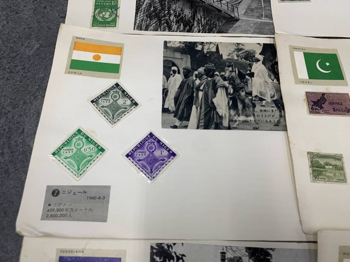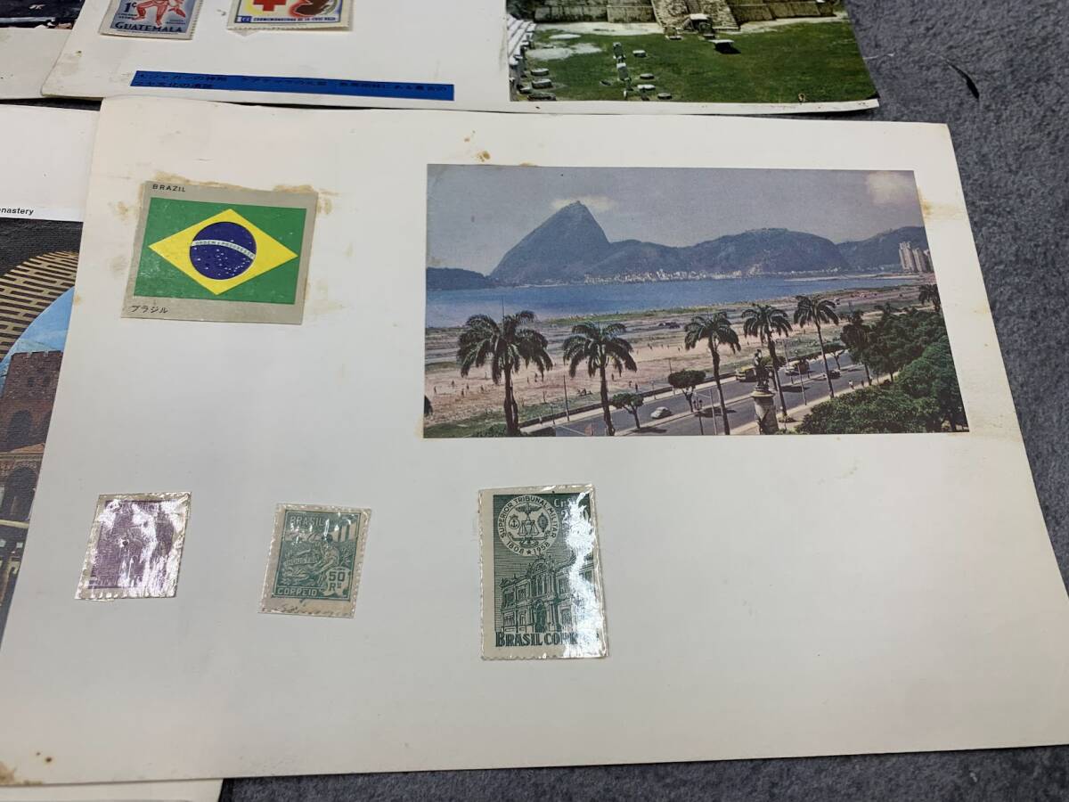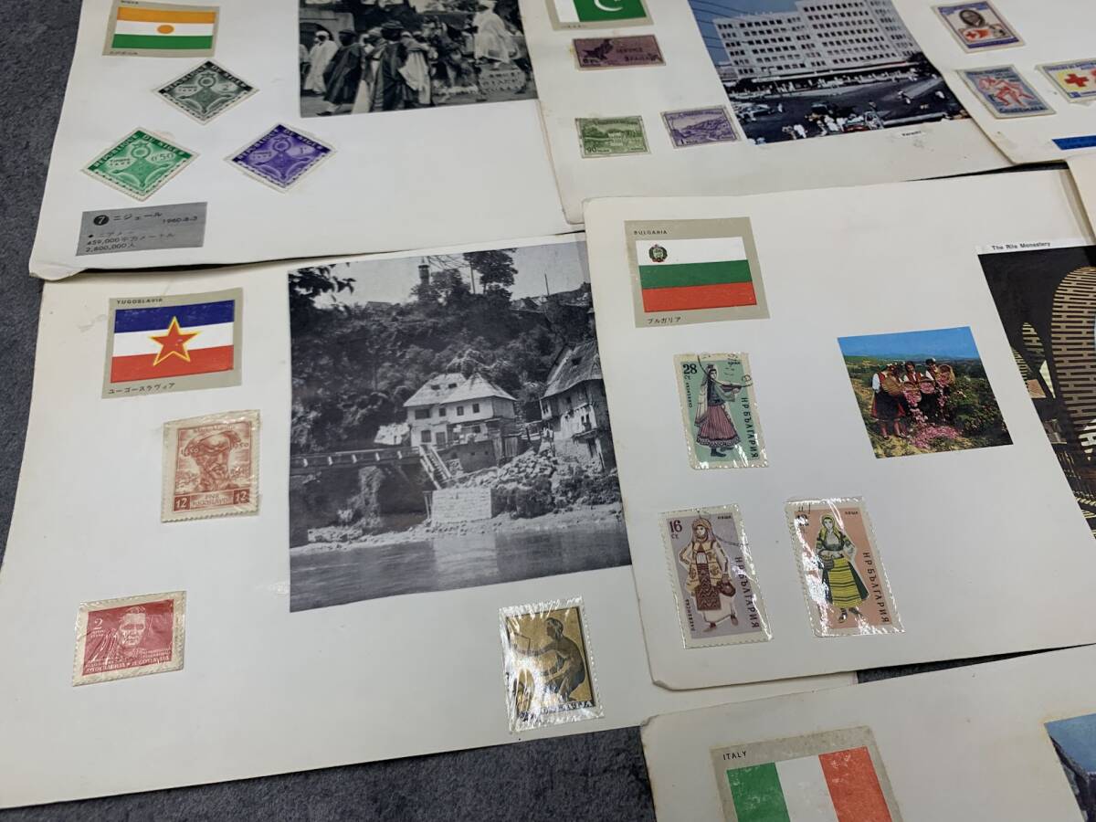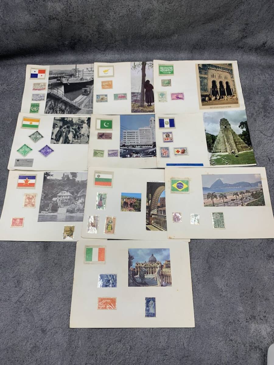 画用紙に古い切手等を貼ってある手作りの各国紹介紙です。コレクション、資料にいかがでしょうか?