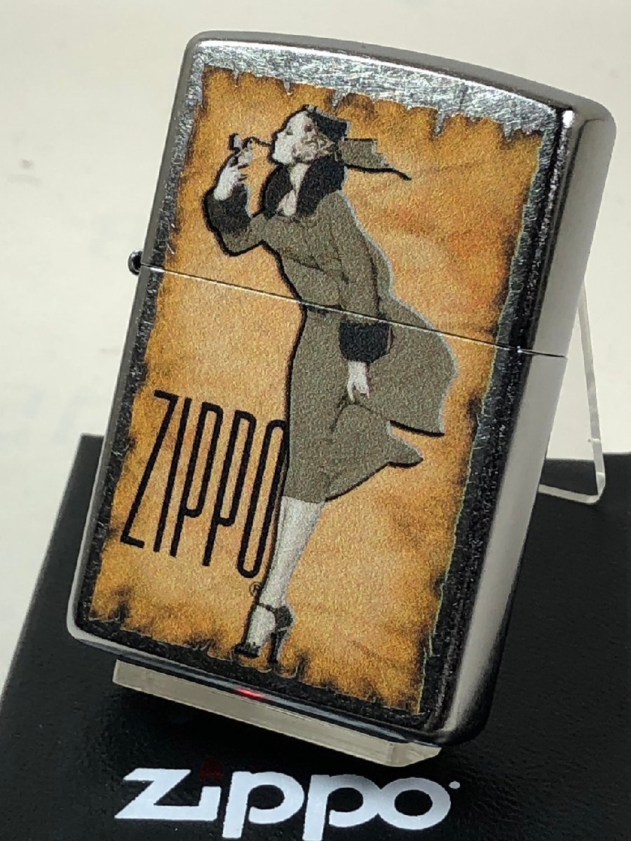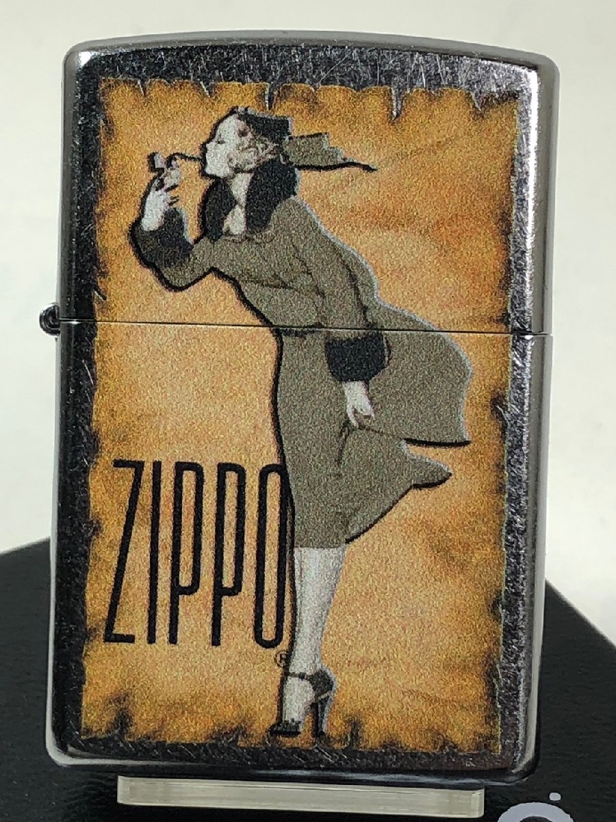 ★Zippo Windy ウィンディ・ガール、風に強いをイメージした「人気のZippoの広告塔(Windyガール)」、純正Zippo#207ベース(ストリートクローム)、ウィンディーBoxデザイン、アメリカZippo社純正加工。裏面はクローム銀色の無地。