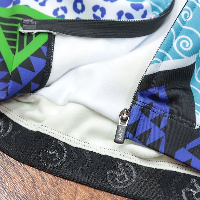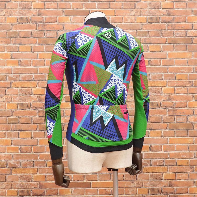 身頃と袖の外側は保温・透湿性に優れたMITI社の起毛素材STELVIO、内袖と脇周りはベンチレーション機能として通気性の高いメッシュ素材MATRIXを組み合わせて作られたサイクルジャージ。80年代スキーウェアをイメージした遊び心あふれるデザインが魅力のアイテムです。背面には走りながらでも取り出しが容易なポケットが配置されており、荷物を最小限にすることで長時間ライドによる体への負担軽減を考慮された嬉しい作りとなっています。