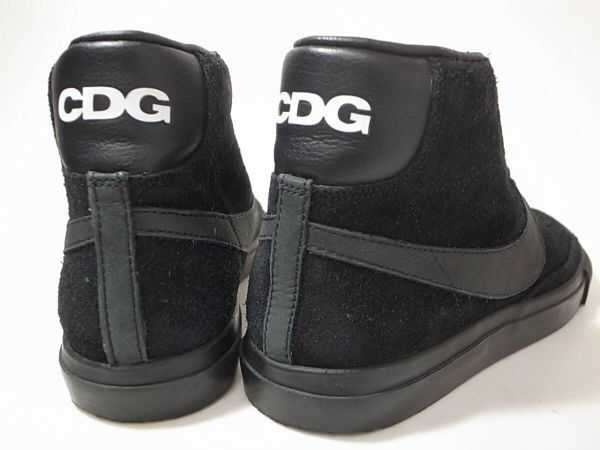 COMME DES GARCONS BLACK x NIKE BLAZER HIGH SP / CDG US7/25cm、美中古、箱無しです。COMME DES GARCONS BLACK とNIKEのコラボレーションモデルです。ブランド名からのブラックで統一されたシックな配色にヒールカウンターのCDGのホワイトのロゴが映えます。使用感の少ないきれいな美中古品です。目立つようなヨゴレ、キズは無く、つま先部分の履き皺もほとんどありません。
