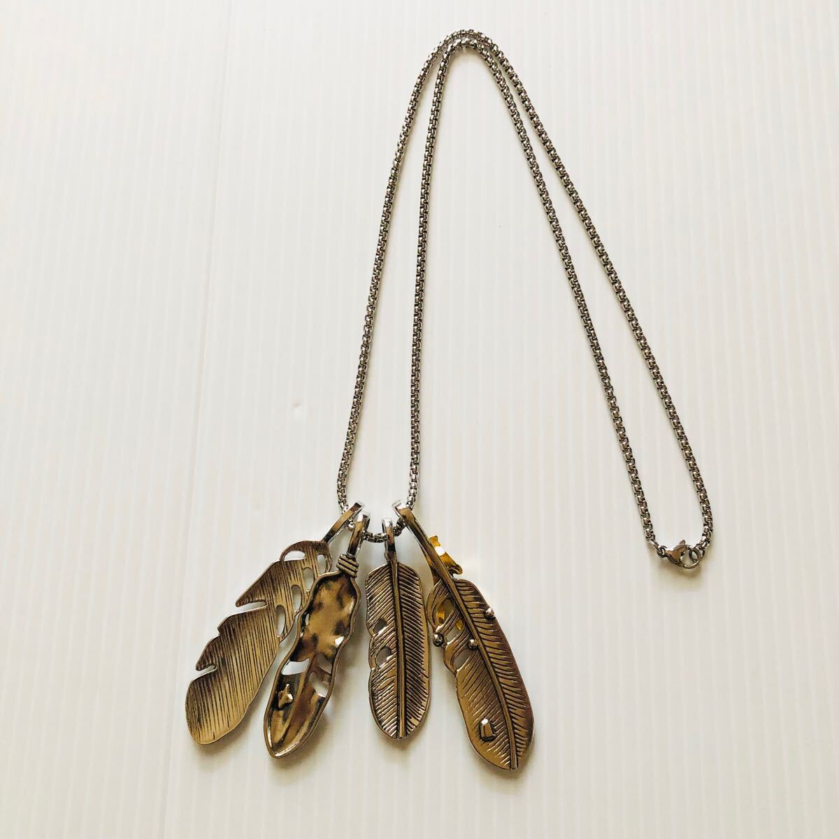 チェーンの長さ70cm、フェザーの一番長いのは6.2cm、短いのは4.8cm、石はターコイズ、フェザーの素材は不明。