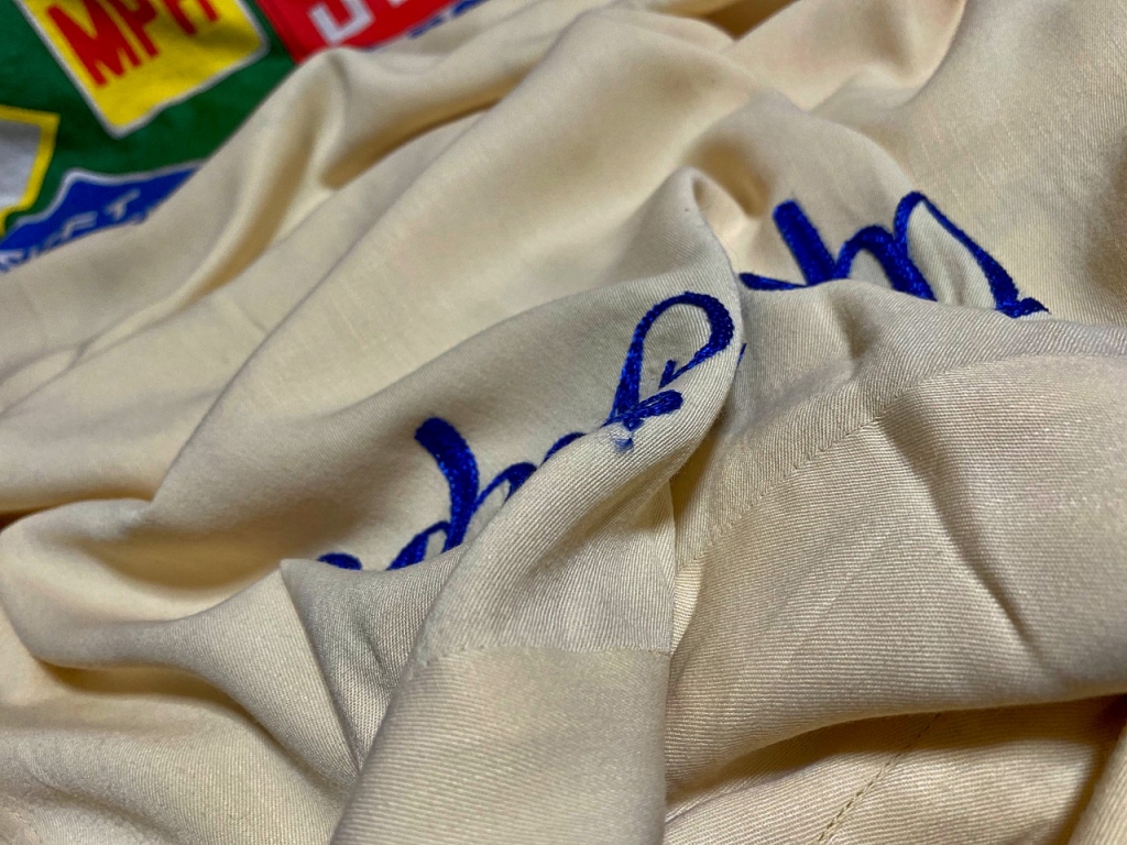 胸と背中に施されたチェーンステッチの刺繍に襟とポケットフラップにハンドステッチが施された1940年代~頃のRamller製ビンテージレーヨンギャバシャツです。