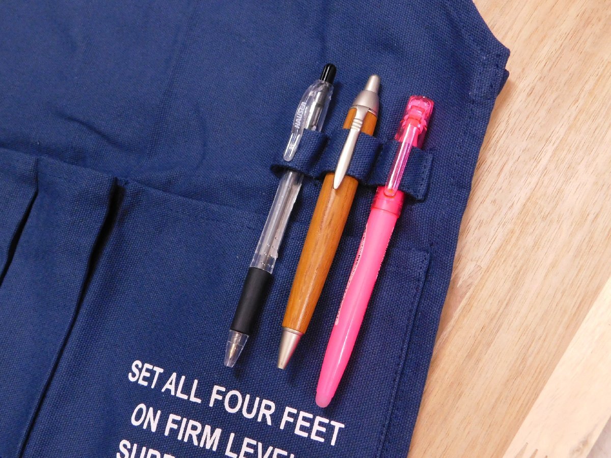 深さのある大きなポケットが2つ、ツールポケットが3つ、ペンを留められるループが3つ付いているので、作業時にとても便利。
