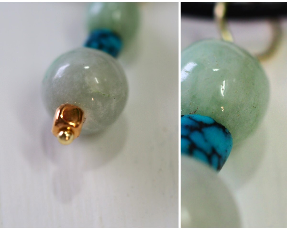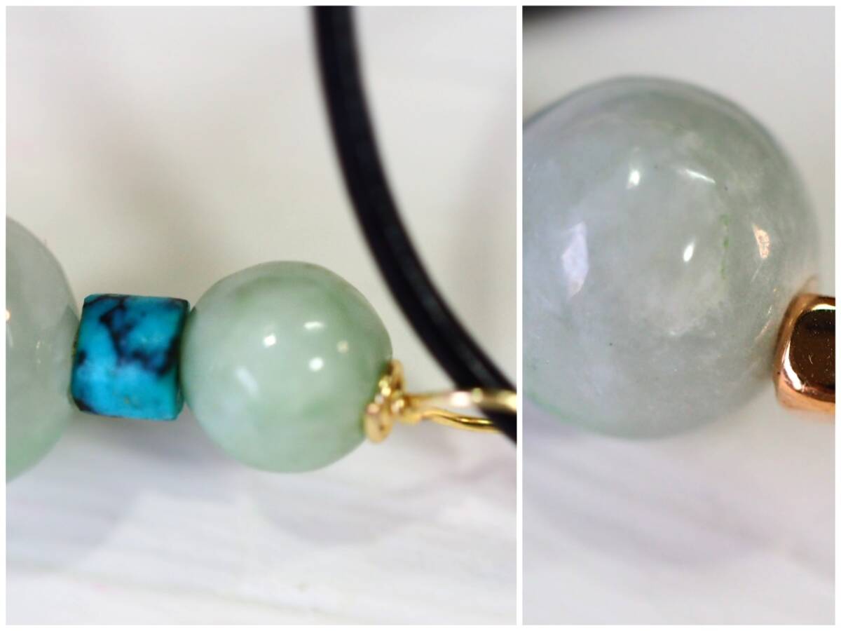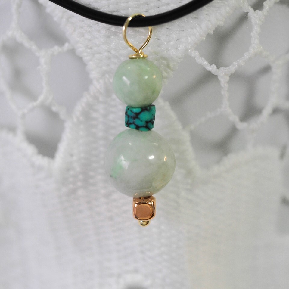こちらはセミラウンド糸魚川翡翠と天然バロックトルコ石を組合わせた紐ネックレスです。