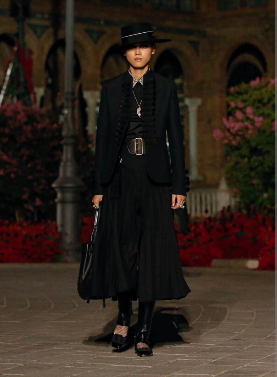 コレクションのテーマである乗馬の世界を投影し、装飾的な解釈を得たモデル。