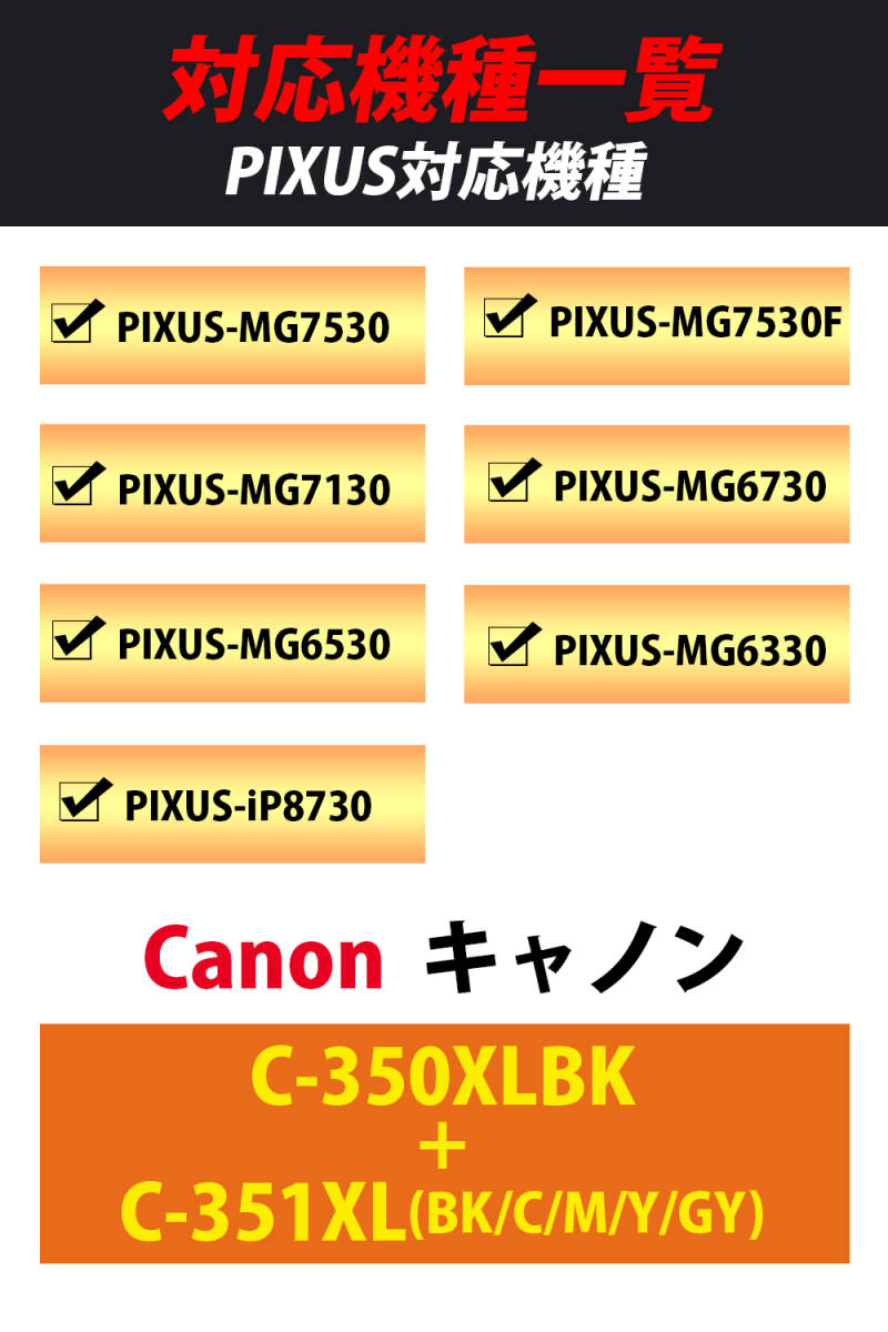 【対応機種】Canon(キヤノン)PIXUS-MG7530 / PIXUS-MG7530F / PIXUS-MG7130 / PIXUS-MG6730 / PIXUS-MG6530 / PIXUS-MG6330 / PIXUS-iP8730 ※MG5630 / MG5530 / MG5430 / MX923 / iP8730 / iP7230 / iX6830の各機種においては351XLGY(グレー)以外はご使用になれます。