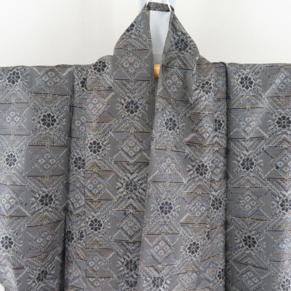 | 紬 着物 紬 アンサンブル 羽織付 幾何学文様 袷 広衿 灰色 正絹 カジュアル 仕立て上がり 身丈154cm |