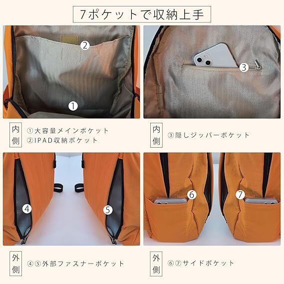 【大容量収納&7ポケット】折りたたみ傘、水筒、携帯電話、ポーチ、長財布、眼鏡ケース、本など、さまざまなものを簡単に収納できる収納神器ともいえるリュックサックは、外出先での絶好のパートナーです。内部にはパソコンを完璧に収納できる専用ポケットが工夫されており、パソコンを大切にしてくれます。外部には便利なファスナーポケットが2つ設置されており、いつでもよく使うものを手に入れることができます。側面には2つの広々としたポケットが配置され、コップなどの大きなものを置くことができます。内部には大容量ポケットが1つあり、衣類などを収納するための十分なスペースを提供しています。内部ファスナーポケット1つで、貴重な小物を大切に保管できます。1つの内部マジックシールポケットで、小物の収納をより柔軟にします。