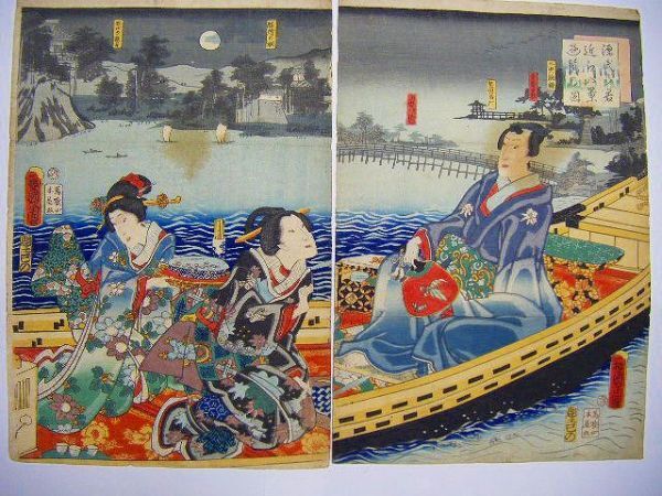 (1)源氏乃若 近江八景 遊覧乃図 2枚・国周、画・馬喰、四木屋、板・彫巳の