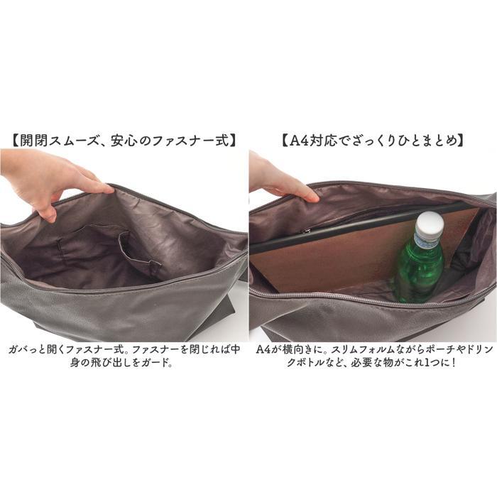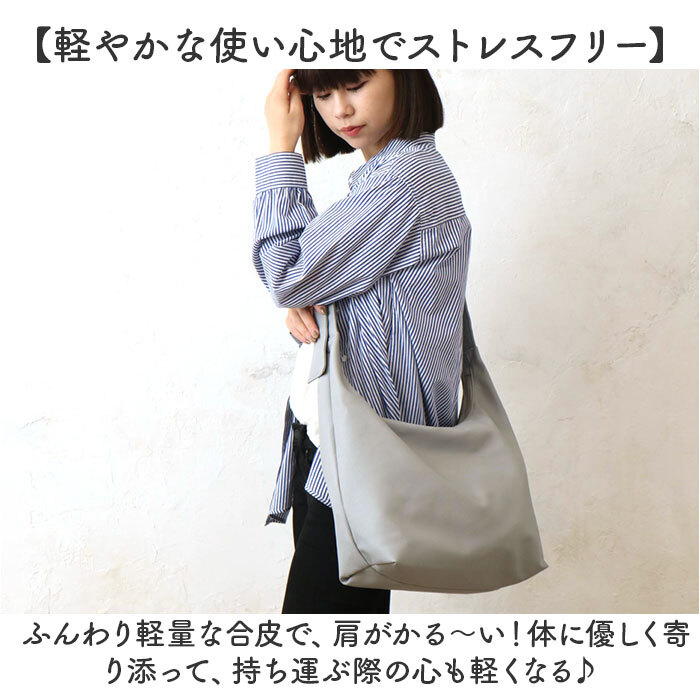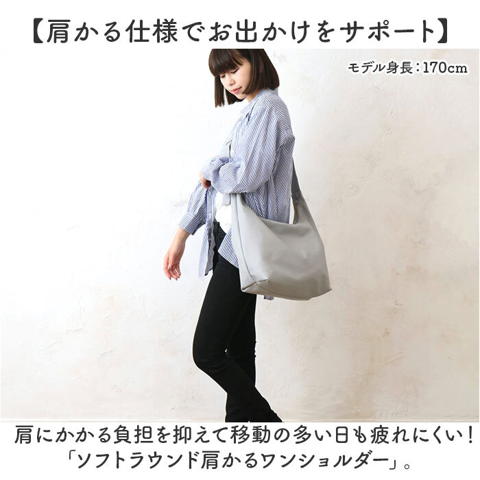 商品説明 | ・・【肩かる仕様でお出かけをサポート】 ・肩にかかる負担を抑えて移動の多い日も疲れにくい!「ソフトラウンド肩かるワンショルダー」。 ・【軽やかな使い心地でストレスフリー】 ・ふんわり軽量な合皮で、肩がかる~い!体に優しく寄り添って、持ち運ぶ際の心も軽くなる♪ ・【食い込むことなく肩掛けラクチン】 ・ショルダーは幅広&クッション性のあるウレタン入り。長さ調節して、肩掛けも斜め掛けも自在◎ ・【開閉スムーズ、安心のファスナー式】 ・ガバっと開くファスナー式。ファスナーを閉じれば中身の飛び出しをガード。 ・【A4対応でざっくりひとまとめ】 ・A4が横向きに。スリムフォルムながらポーチやドリンクボトルなど、必要な物がこれ1つに! ・【サクッと取り出せて迷子知らず】 ・内側にポケットを3つ配置。細々した物も、バッグの中で探す手間が不要。 ・【気軽に使えてヘビロテ間違いなし】 ・シボのある本革のような仕上がりながら、お手入れは拭き取るだけ。デイリーに活躍する相棒☆ ・【ポケット仕様】 ・内側:ファスナーポケット×1、オープンポケット×2 |