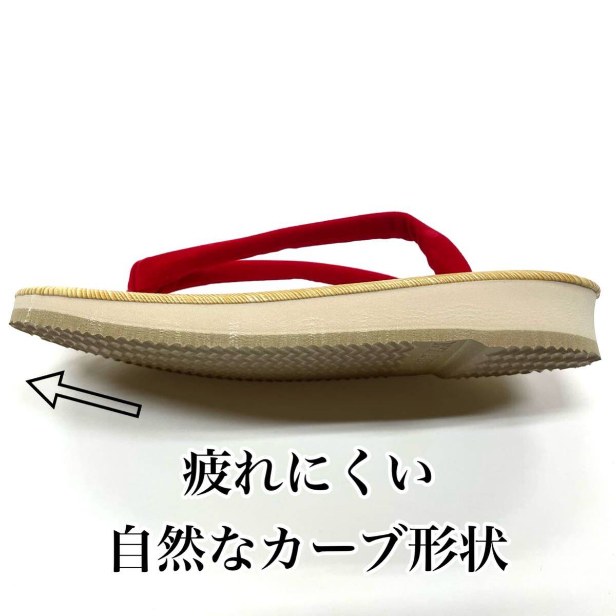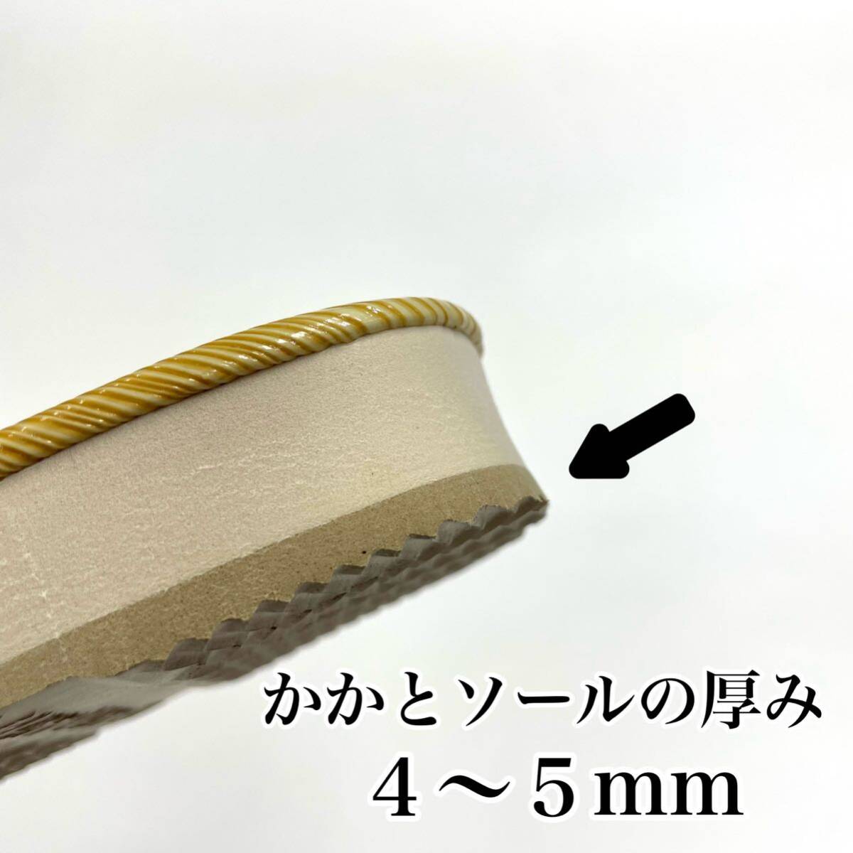 こちらの草履は足の裏と同様自然なカーブ形状となっているので「スニーカーのように母指球を中心に体重移動」ができ、特に一番スリ減りやすいカカト部分のソール厚みが約4~5mmもあるので、普段履きや踊り用として大変人気な【日本製の草履】となっております。