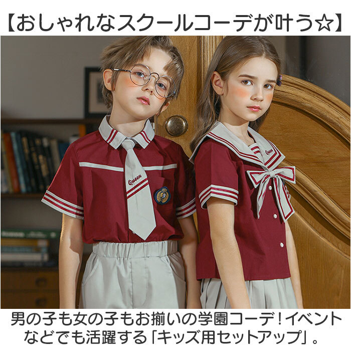 | 商品説明 | ・・【おしゃれなスクールコーデが叶う☆】 ・男の子も女の子もお揃いの学園コーデ!イベントなどでも活躍する「キッズ用セットアップ」。 ・【コーデが完成する4点セット】 ・トップス、ボトムス、タイ、バッジのセット。目を惹くカラー使いやデザインが魅力◎ ・【シャツトップスにバッジをON】 ・前ボタンを留めるだけで、サッとお着替え。胸元にバッジを付ければ、制服感がアップ。 ・【首元にアクセントをプラス】 ・パッと華やぐタイ。伸縮性のあるゴム仕様&お好みの長さに調節でき、着脱も簡単。 ・(※1)ボーイズ用はネクタイ、ガールズ用はリボンタイです。 ・【自分サイズにすっきりフィット】 ・ボトムスは締めつけを感じにくく、心地よくフィットするウエストゴム仕様。 ・(※2)ボーイズ用はパンツ、ガールズ用はスカートです。パンツはポケット付き。 ・【活発に動き回っても大丈夫】 ・スカートにはサラッとした生地感のインナーパンツを。元気に動くガールズも安心のつくり。 ・【コスプレや衣装にもおすすめ) ・イベントでのコスプレに!発表会や演奏会の衣装としても大活躍◎ |
