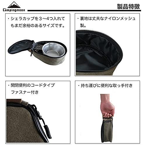 ・グリーン S S220-B・サイズ:(約)外径135×高さ190mm(持ち手収納箇所含む)・重量:(約)78g(※シェラカップは付属されません。)・素材:表面/綿100%、裏面/ナイロン・用途:外径120×高さ45mm、容量320ml程度のシェラカップ4個程度を収納できます。 ※形状などにより収納できない場合がございます。・特徴:帆布製である為、染色のおいがなくエコです。持ち手まで収納でき衛生面でもバッチリです。(綿洗い加工)※綿洗い加工により、色の濃さが安定しないため、色の個体差が大きいことを予めご了承ください。