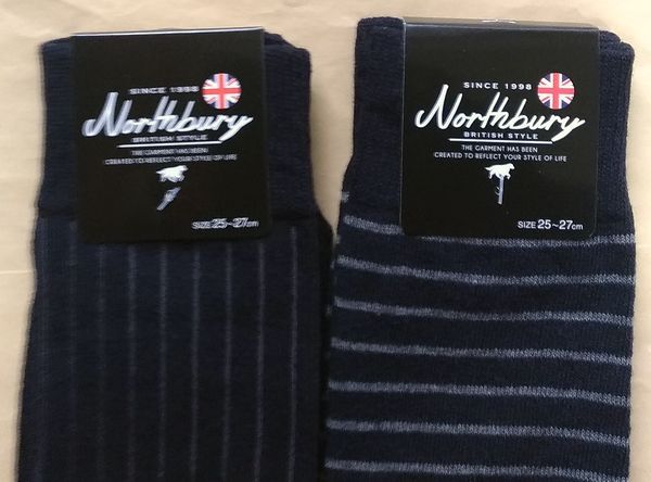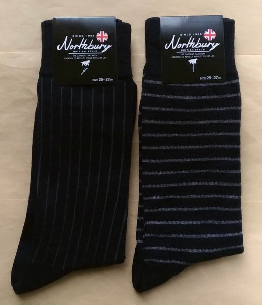 2足とも黒寄りの濃紺系です。縦ラインと横ライン柄です。