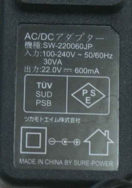 ツカモトエイム ACアダプタ SW-220060JP 22.0V 800mA 動作OK