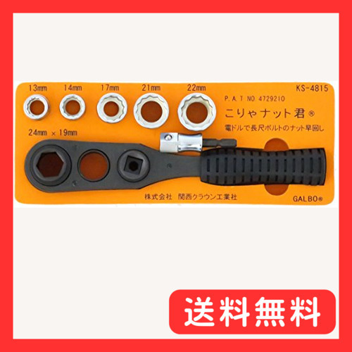 「電動ドライバー補助工具 こりゃナット君 KS-4815」▼4940024151011▼(商品説明)・ブラック KS-4815・セット内容:貫通ソケット13mm 14mm 17mm 21m 22mm 本体説明 アンカーボルトのネジ深さに関係なく使用可能です。ソーラー架台、ダクト取付、歩道橋、ガードレールなど、入り組んだアングルやナットの締め付けに手間暇のかかる狭い作業空間に適した工具です。電動ドライバーの回転と内臓ギアが連動してヘッド部分が駆動。通常真上から行うナットの締め付け作業を横位置から行えます。