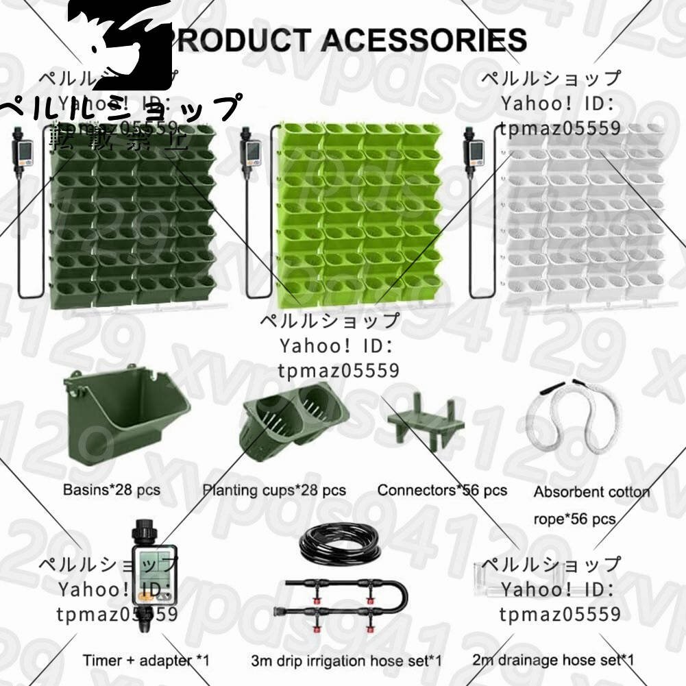 当社の垂直壁プランター点滴灌漑システム キットには、28 個の植木鉢、スマート タイマー給水器、ドリッパーが含まれています。シンプルな設置設計。壁に垂直の庭園を簡単に作成できます。仕様:名前:垂直壁プランター材質:環境PP正方形あたりの数量: 28 (56 穴)寸法 (長さx幅x高さ): 24*14*14cm/1個平方メートルあたりの最大耐荷重:約31KG/平方メートル貯水量:約250mlパッケージ:1 * プランターレイズドベッドキットタイマー+アダプター×1セット点滴灌漑ホースセット 3メートル排水ホースセット2メートル