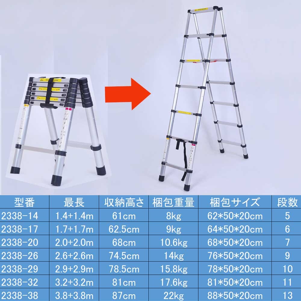 商品仕様 | ステップ:11段+11段 材質:アルミニウム 最大負荷:100kg 最長:全長320cm×320cm 足の幅:150cm ステップ間の幅:30cm 折りたたみサイズ:長さ-46cm幅-13.5cm高さ-81cm 上部の幅:130mm~140mm ペダル幅:40mm 重量:16.5kg ※仕様は改善の為に予告なく変更する場合があります。 ※一人乗りを想定した設計となります。二人乗りでの使用は推奨致しません。 ※重要:当商品は両サイド同じ段数でご利用されること想定して製品化されたものであり、両サイドの段数が相違がありますと、載重の負荷が偏り、不安定になり、ロック掛からないような不具合生じることがございます。 製品の性能上ご理解の上、ご購入検討くださいませ。 コンパクトな折り畳み式デザイン。スペースを省いて、狭い場所でも収納できます。 【特徴】 高品質の折りたたみ式伸縮脚立。折りたたみ式のデザインで、軽量でありながら耐久性があり使いやすく、持ち運びも簡単です。 安全ロックの設計により、伸縮がはるかに簡単になります。伸縮自在で1段ずつ引き伸ばしが可能で、必要な高さでロックでき、最長320cmまで調整可能です。 脚立には高品質のゴム製の脚が付いており、安定性とグリップ力が向上し、隣接する2つのステップ間の安定したロックにより、衝突や摩擦を防ぎます。 最高水準で製造されたこの脚立は、EN131規格に準拠しており、CE登録されています。 |