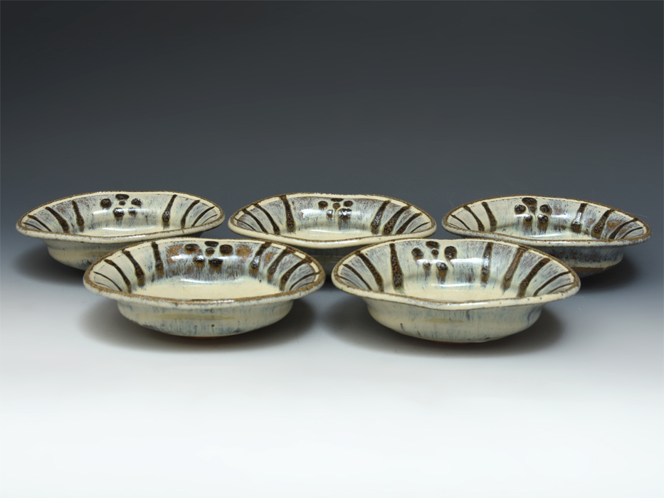久窯 鶴田純久 (造) 斑唐津 向付 5客揃です。 見込みに溜まった滑らかな藁灰の釉調が美しいお品です。 目立ったダメージ等なくコンディションは良好です。 ※撮影の際に生じた写り込みなどがございます。 ご理解の程よろしくお願い致します。 |