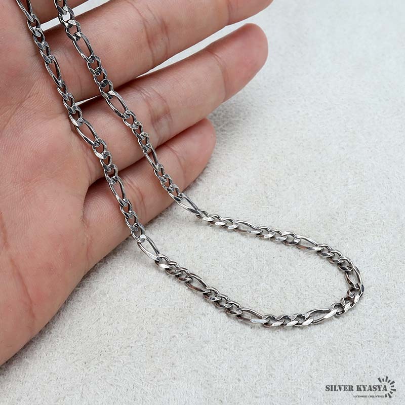 長いコマと短いコマを組み合わせて連ねたお洒落なデザインが魅力のフィガロチェーンネックレス。細身ながらもユニークな6面カットと燻し加工により存在感をプラス。SILVER KYASYA独自のオリジナルデザインアイテムで、ここにしかないデザインを楽しめます。
