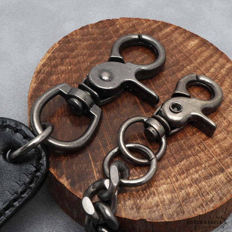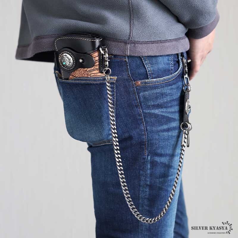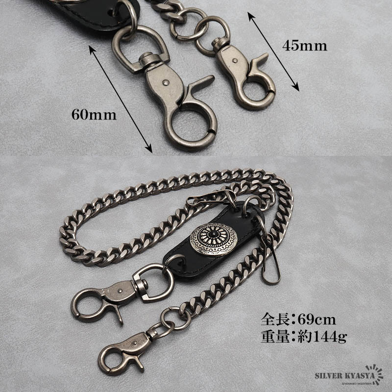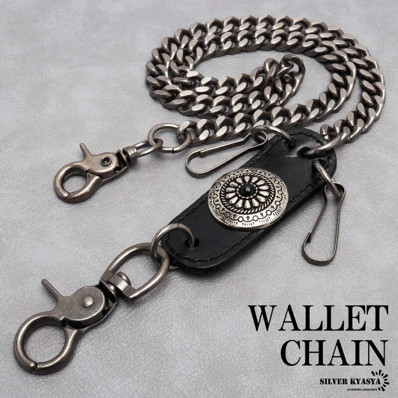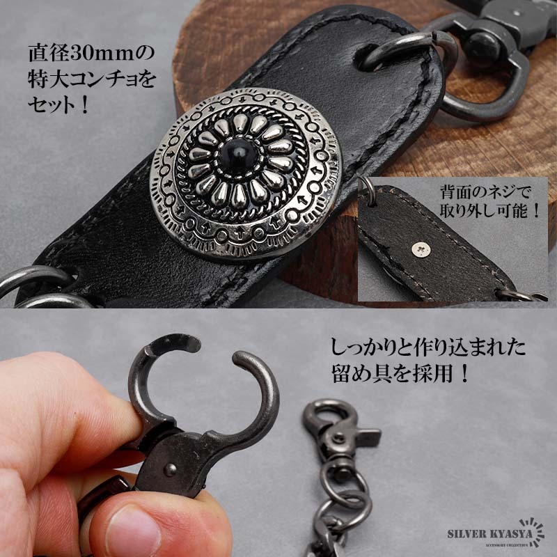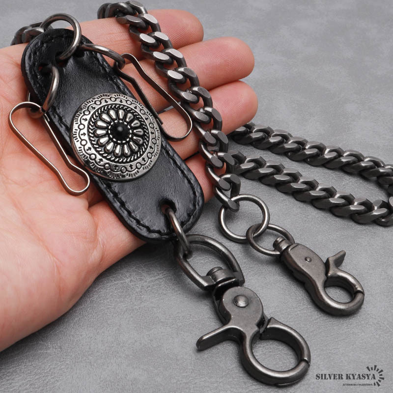 牛革 コンチョ ウォレットチェーン 喜平チェーン ブラック レザー 燻し風仕上げ メンズ 2クリップ 財布紐 重厚 財布 鎖