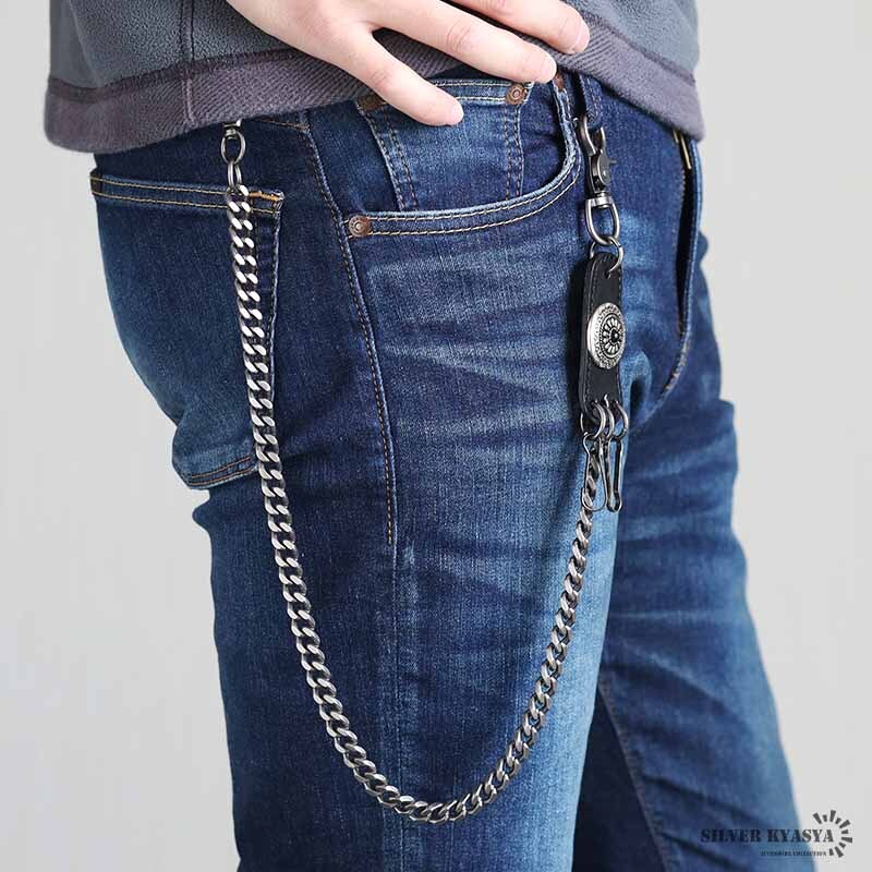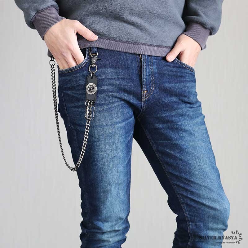 レザーにあしらわれた特大のコンチョが目を引く存在感抜群のウォレットチェーン。燻し風加工による深みのある風合いがアンティークな雰囲気を演出するアイテム。