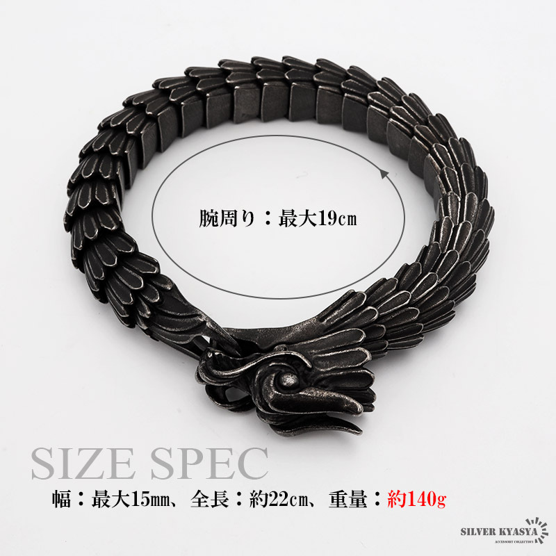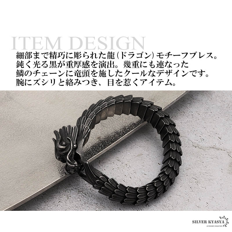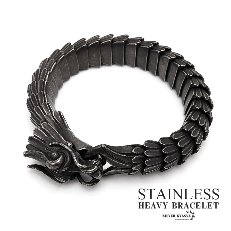 重厚 ブレスレット メンズ ステンレス ドラゴン 龍 竜 マットブラック 黒 燻し ごつい ごつめ 金属アレルギー 19cm