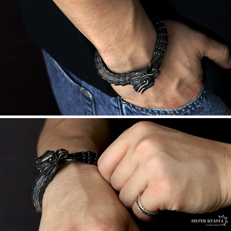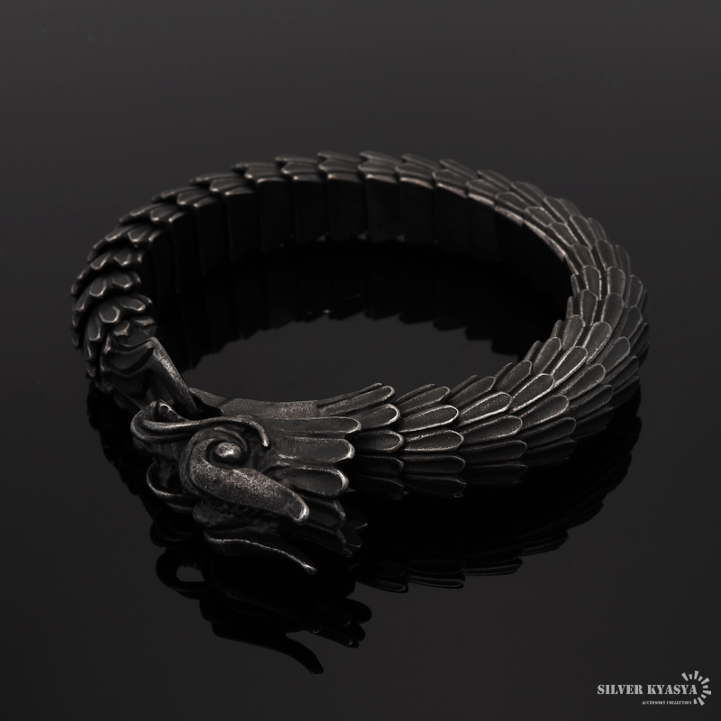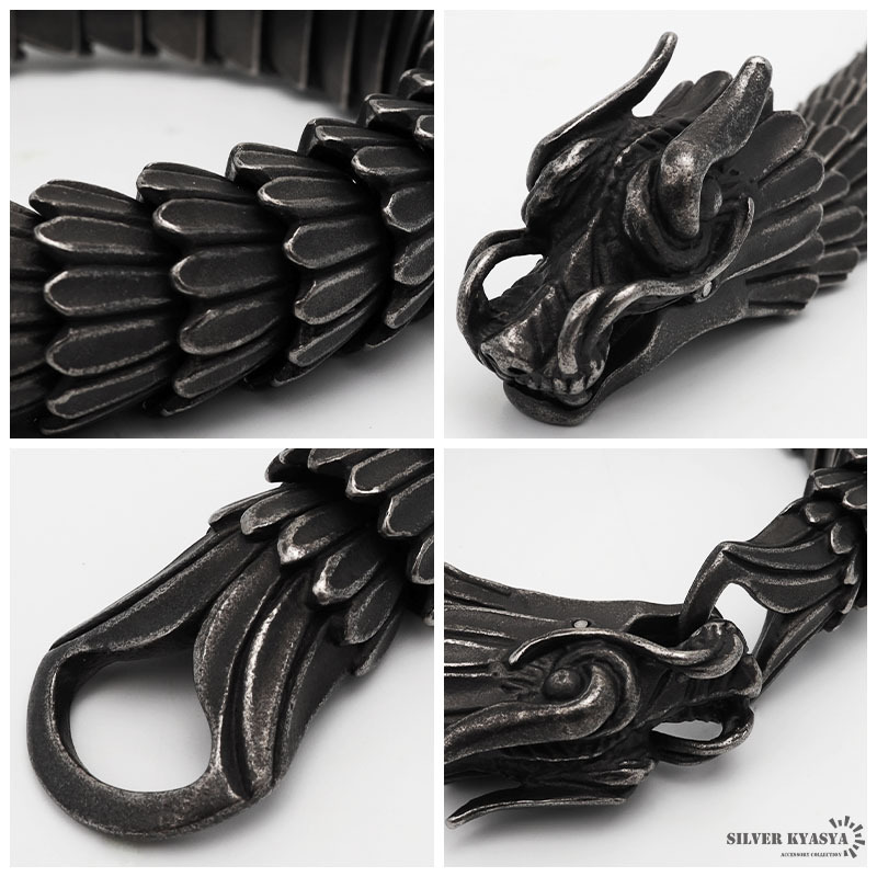 細部まで精巧に彫られた龍(ドラゴン)モチーフブレス。鈍く光る黒が重厚感を演出。幾重にも連なった鱗のチェーンに竜頭を施したクールなデザインです。腕にズシリと絡みつき、目を惹くアイテム。