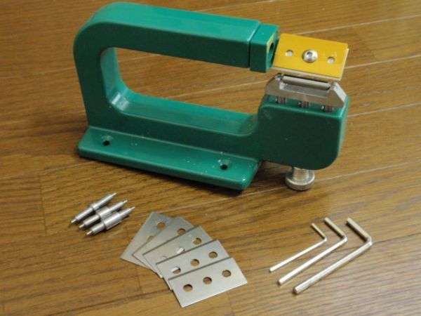 革をご用意いただければ、すぐに利用可能です。使用方法はかんたんで、革を挟んで引くだけです。ダイアル式厚み調整がついており、微調整することによりお好みの仕上げができます。