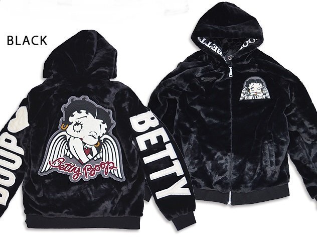 1920年代~40年代にアメリカでワークウェアを中心とした製品を世に送り出したブランド「The BRAVE-MAN」から「BR×BETTYコラボ ファージャケット(BBB-2244)」のご紹介です。 大きな瞳とぽってりした赤い唇が印象的な女の子、ベティ・ブープ(Betty Boop)。 ボディーには、とてもふわふわな肌触りのファーパーカーを採用。 バックにはベティをダイナミックに刺繍。 フード縁には「BETTY BOOP」のロゴ入りのリボンを縫い付けました。 フロントはジップアップ仕様。 裏地は袖通しの良いポリエステルを切り替えました。 | ||||||||||||||||||||